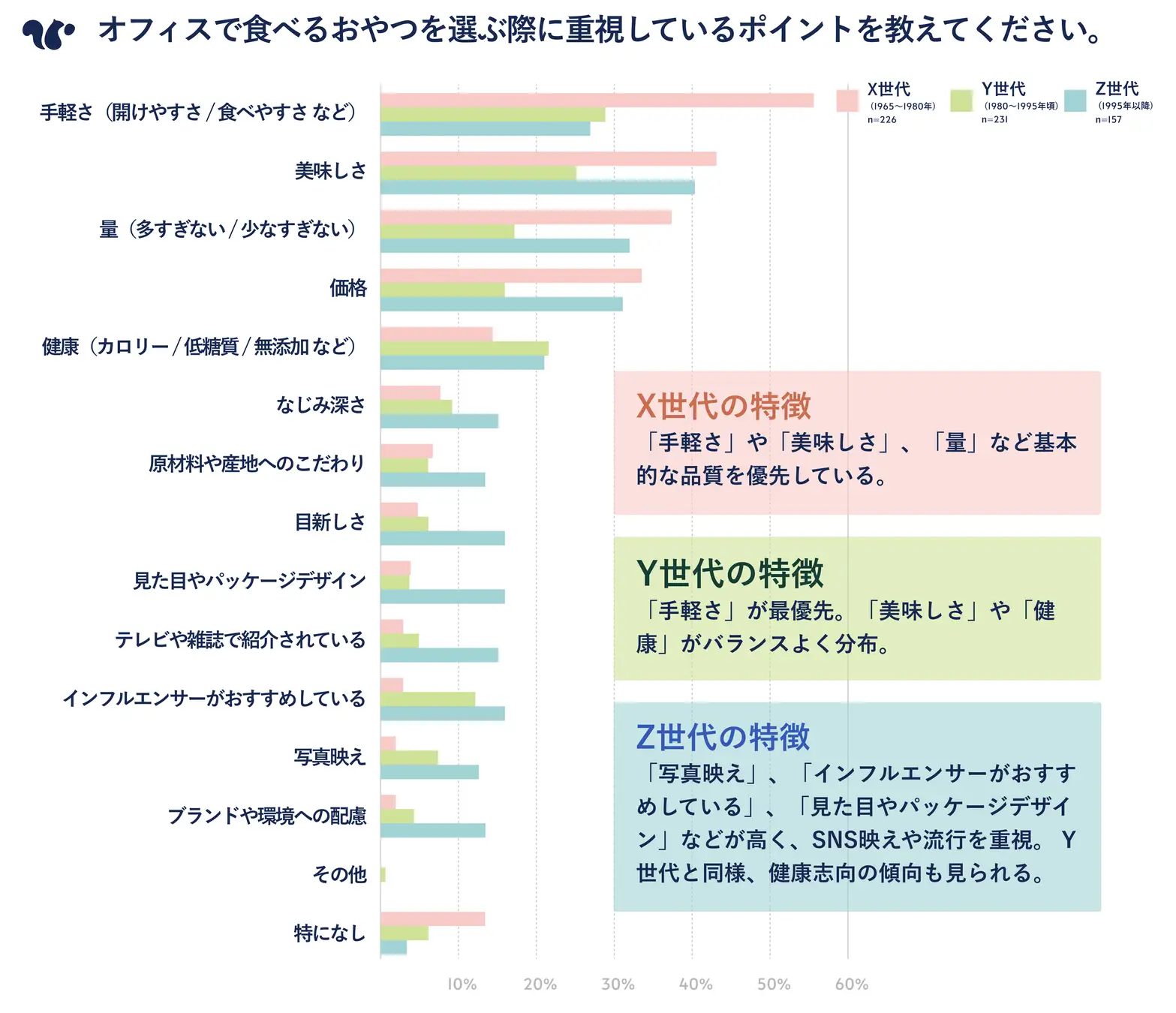 「美味しさ」(40.7%)が最上位ですが、特徴的なのは「写真映え」(12.7%)がX世代(2.0%)の約6.5倍、「インフルエンサーのおすすめ」(16.1%)がX世代(2.9%)の約5.5倍と、他世代と比較してSNSや流行への感度の高さが際立っている点です。Z世代は、味や量だけでなく、“誰かに見せたくなる”か、“話題性があるか”という観点でもおやつを選んでいることがわかります。