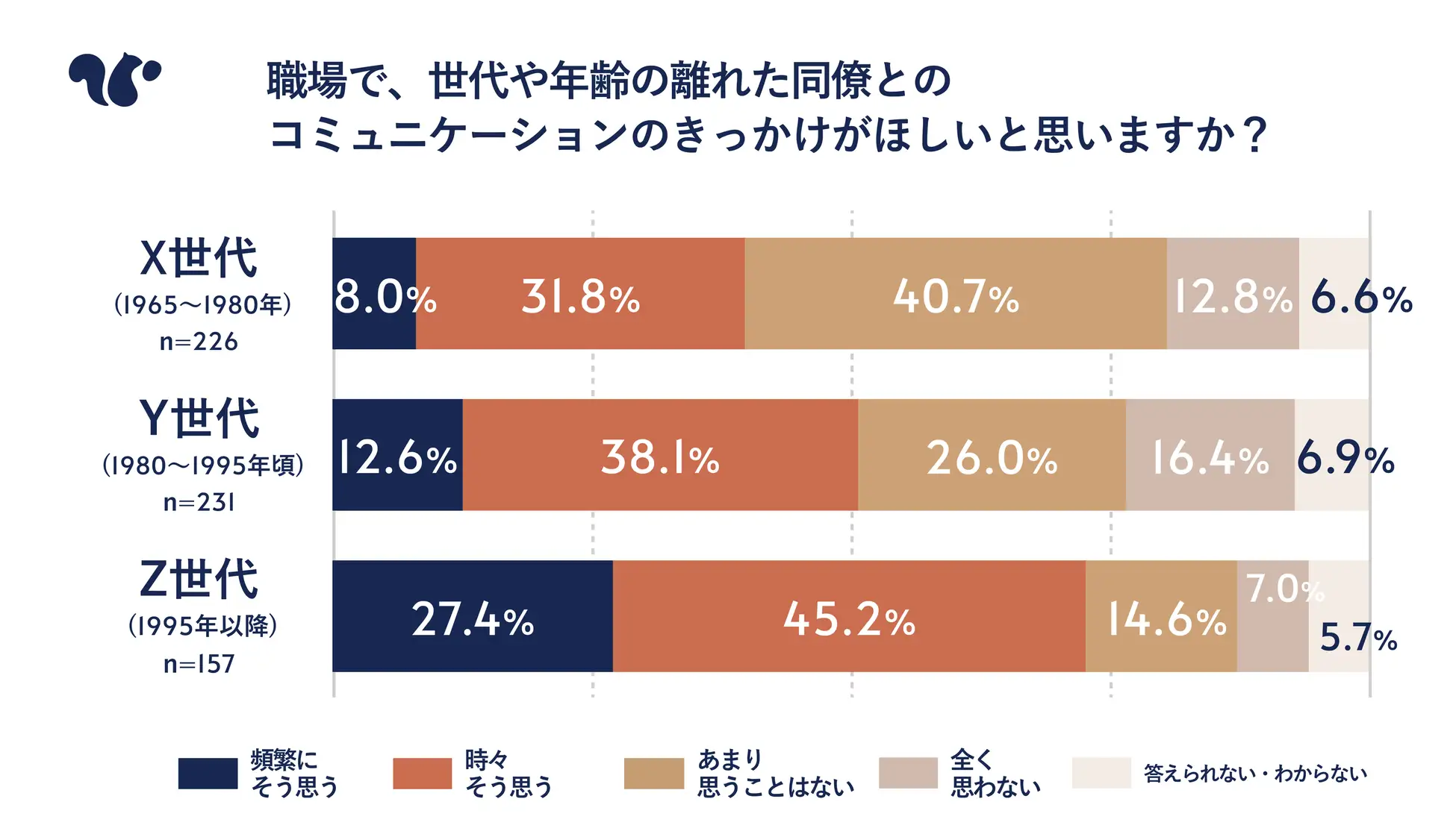 Z世代の約7割が「世代の違う同僚とのコミュニケーションにきっかけがほしい」と回答。Y世代も6割近くが同様に感じており、若い世代ほど交流への意欲が高いことがわかります。