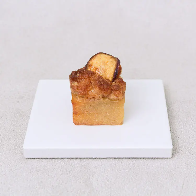 生地とフィリングに紅はるかのさつまいもを贅沢に使用しました。米粉を使用したもっちりとした生地に、アルコールフリーの甘酒を加え、まろやかで優しい味わいに仕上げました。胡桃入りのザクザク食感の米粉クランブルをトッピングし、スナックミーの「さつまいもチップス」を散りばめた、食感も楽しめる商品です。