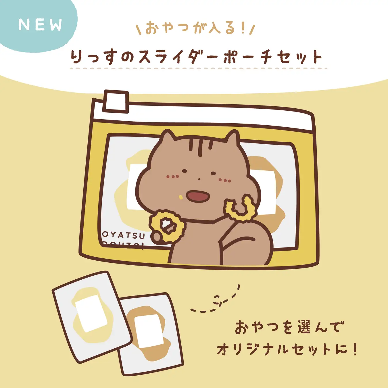 店舗限定のりっすスライダーポーチを新発売!おやつが2個ぴったり入るサイズ感で、おやつを入れるのはもちろん、ちょっとした小物を入れるのにもぴったり。