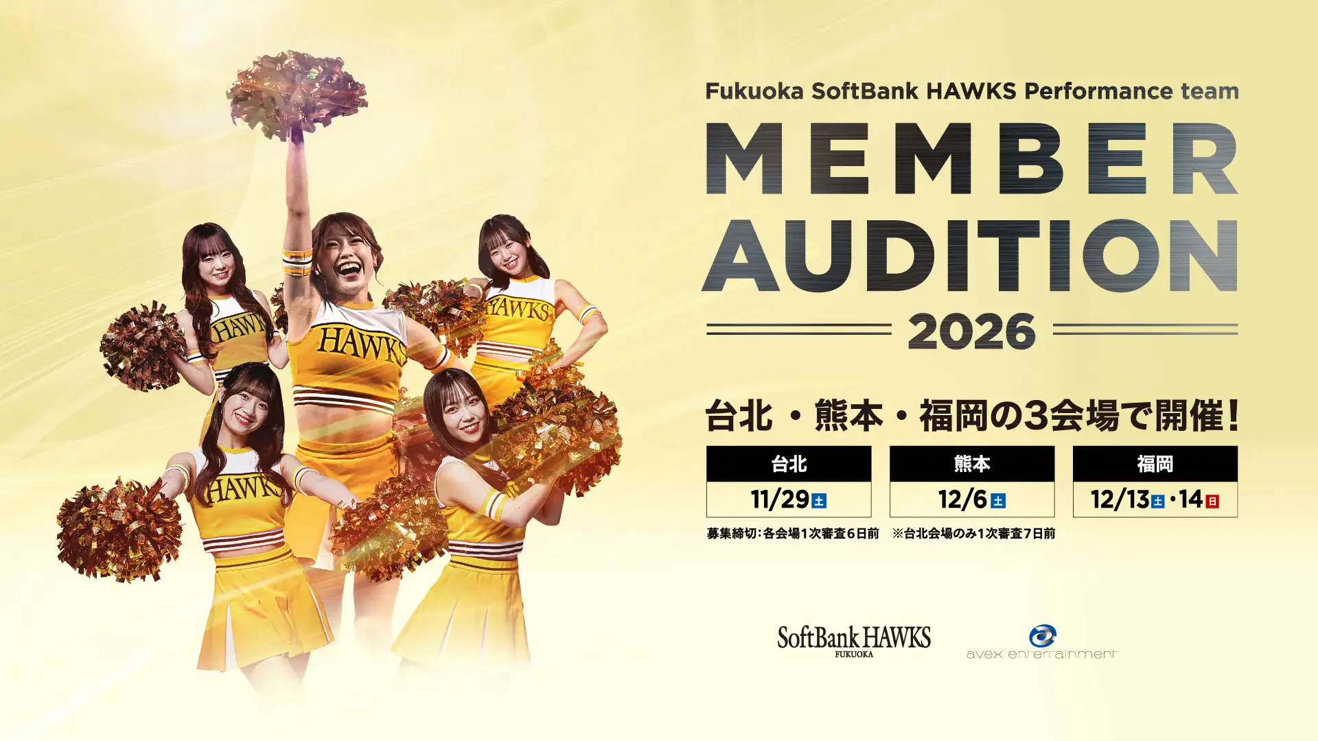 2026年度は、より一層進化したパフォーマンスを披露し、球団スローガン「めざせ世界一」のもと、スポーツの枠を超え、人々に感動と勇気、夢を届けるエンターテインメントを目指します。これに伴い、福岡と熊本の九州2か所、さらに2年連続となる台北にてオーディションを実施いたします。熊本では初開催となり、九州の皆さまにホークスをより身近に感じていただけるよう、九州での参加機会を広げることを目的としています。