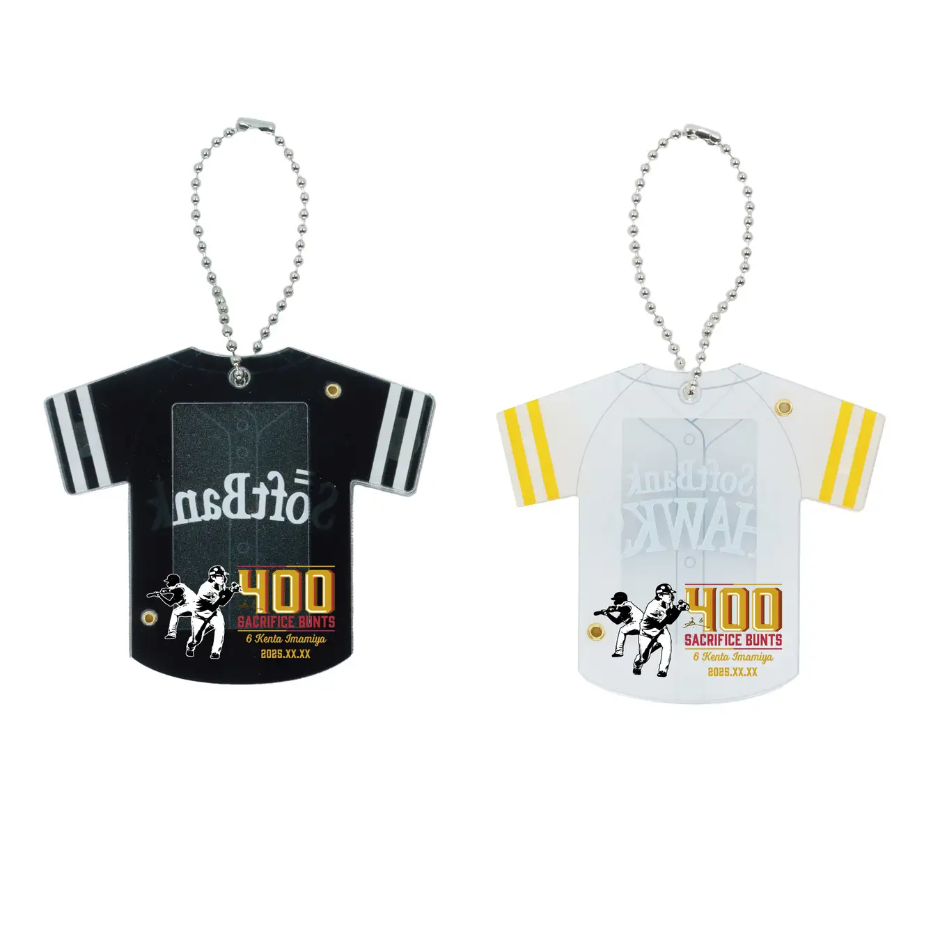 今宮選手が記録達成した試合で着用したユニフォームを切り分けて、アクリルキーホルダーに入れ込んだ数量限定の記念グッズです!記録ロゴが入った特別仕様のボックスに入れてお届けします。