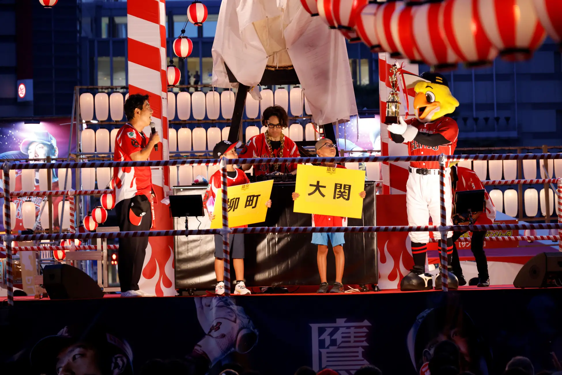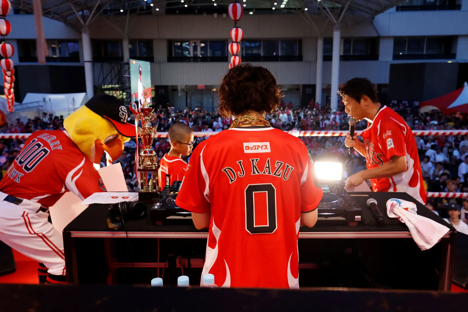 中盤では、「鷹祭 SUMMER BOOST」の5試合を振り返るトークセッションを実施。原口さんとDJ和さんが名場面を語った後、ファン参加型の「MVP投票」がスタートしました。ノミネートされた選手が一人ずつ紹介されるたびに会場から拍手が送られ、接戦の末、MVPは大関投手と柳町選手に決定。発表の瞬間には歓声が響き渡り大関投手と柳町選手の登場曲がDJ和さんの手で流れ、会場に歓声が起こりました。