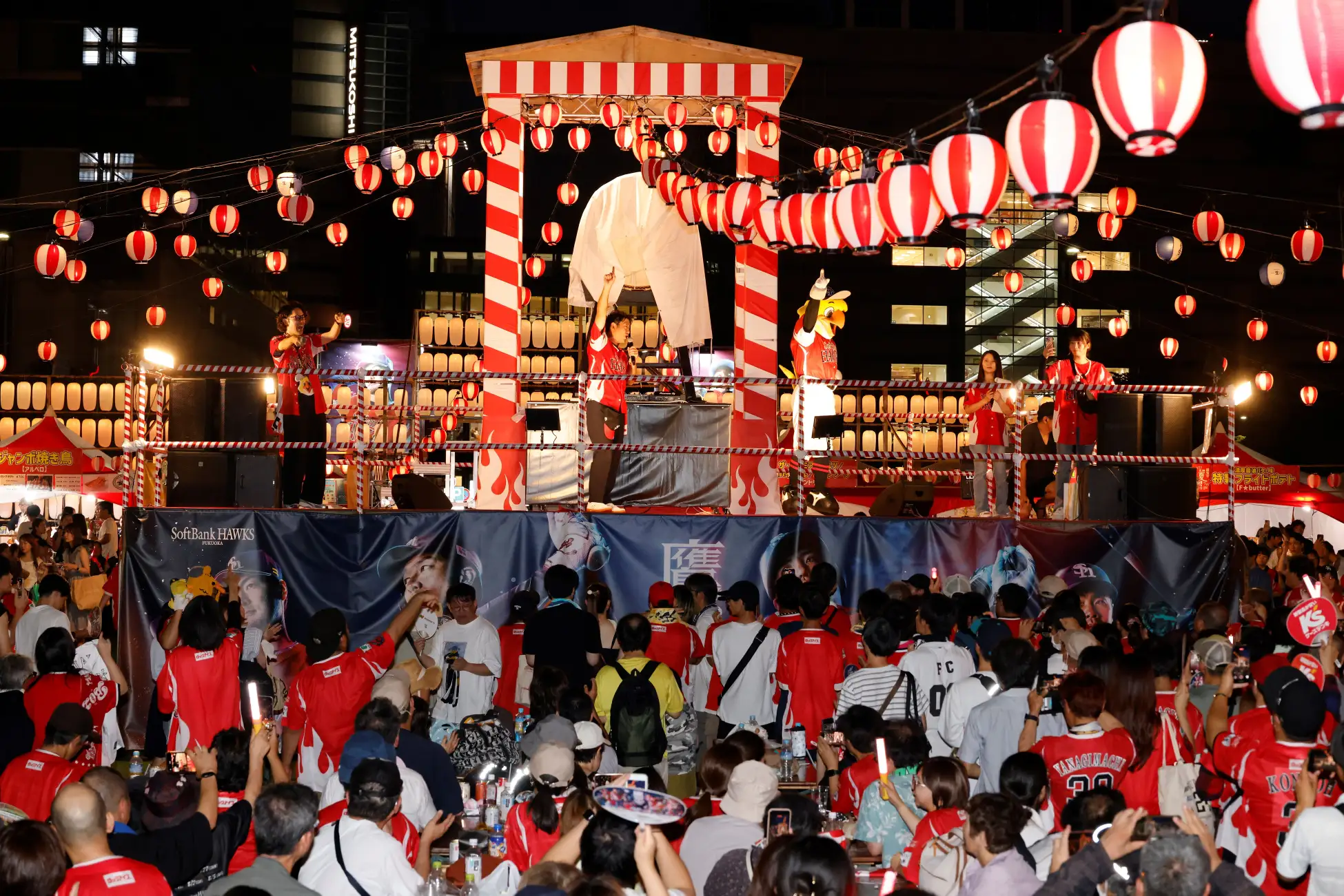 イベント終了後には、天神夏まつりの名物「盆踊り」へと続き、野和太鼓の力強い演奏に合わせて、参加者が櫓を囲んで踊りの輪を広げました。福岡のまちとホークスファンが、最後までひとつになった夜となりました。