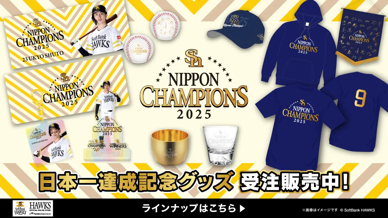福岡ソフトバンクホークス株式会社(本社:福岡県福岡市 代表取締役社長 CEO:後藤芳光)は、本日10月30日(木)にSMBC 日本シリーズ 2025第5戦で阪神タイガースに勝利し、5年ぶり12度目(ソフトバンクホークスとして8度目)の日本一を達成いたしました。これを記念したグッズを販売します。