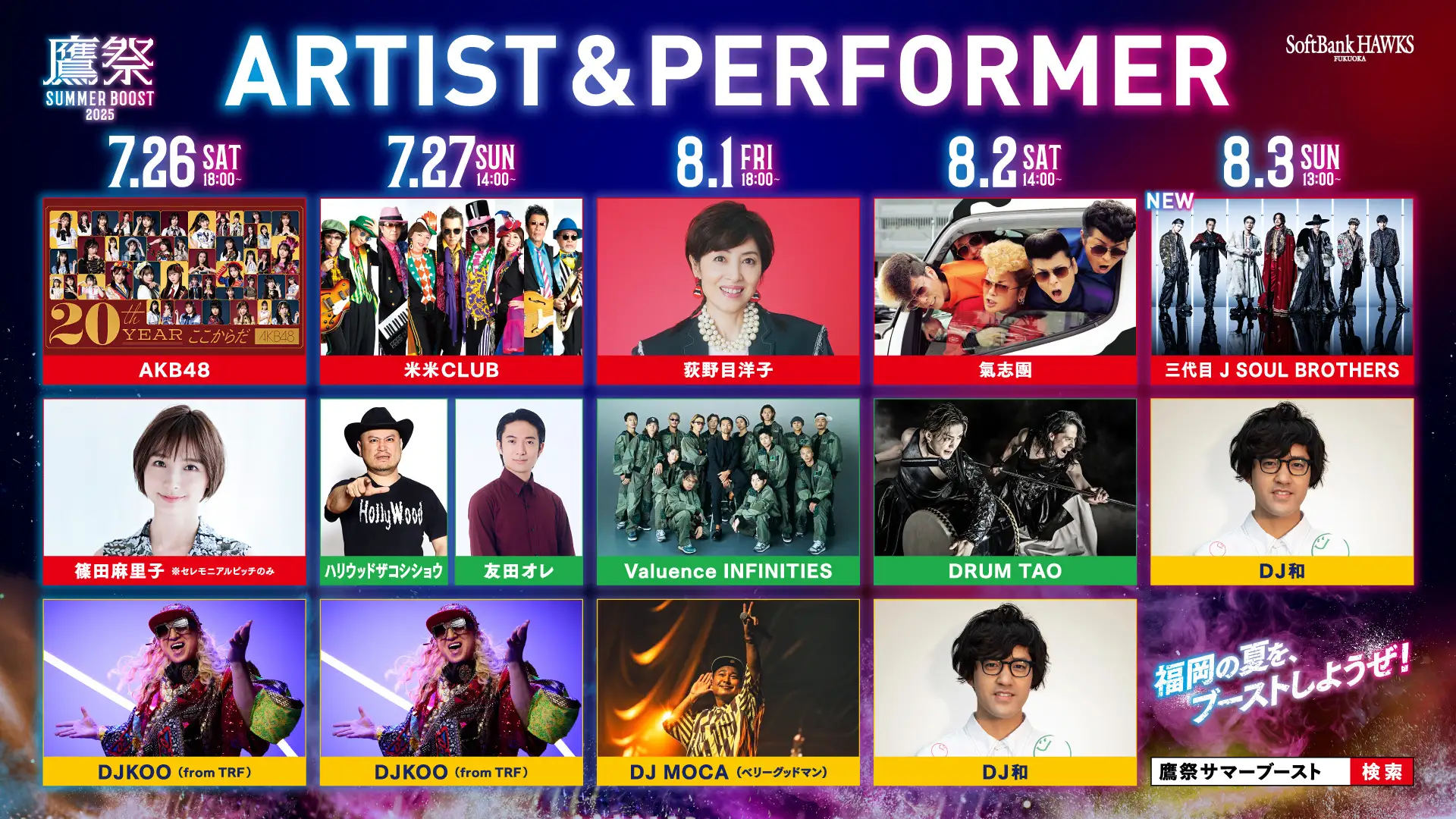 みずほPayPayドームで開催する「鷹祭 SUMMER BOOST 2025(たかさいサマーブースト)」の初日となる7月26日(土)のゲスト「AKB48」の出演メンバー16名が決定しました。今年で20周年を迎える「AKB48」が、ソフトバンクホークス誕生20周年のホークスを熱くブースト!ここでしか見られないコラボを、ぜひ目に焼き付けてください!チケットは販売中です。