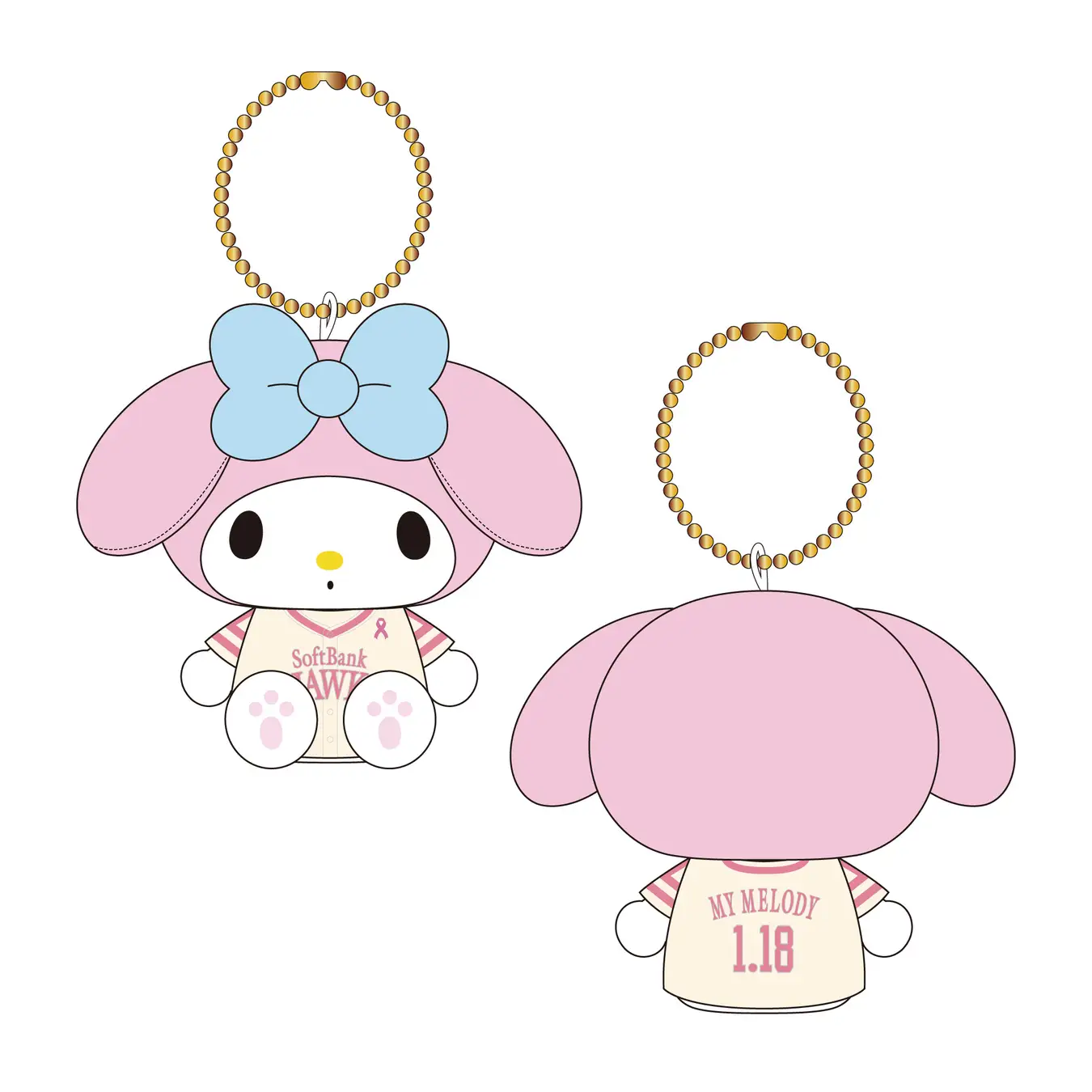 シナモロールとホークス選手のコラボや、ピンクリボンユニフォームを着たマイメロディ、シナモロールのグッズのアイテムを一部ご紹介します♪