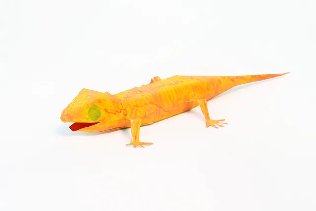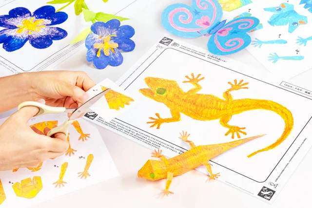 《鼓動する谷のグラフィティネイチャー》で描いた絵が、ペーパークラフトになります。カエルやヘビなど、《鼓動する谷のグラフィティネイチャー》で描いた絵が、それぞれ展開図になり、その展開図を組み立てると、世界で一つだけのペーパークラフトが出来上がります。