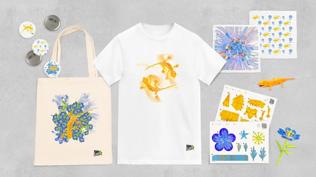 《鼓動する谷のグラフィティネイチャー》で自分が描いて生まれた生き物が、その場でオリジナルの缶バッジ、ハンドタオル、Tシャツ、トートバッグ、ペーパークラフトになり、思い出を持ち帰ることができます。