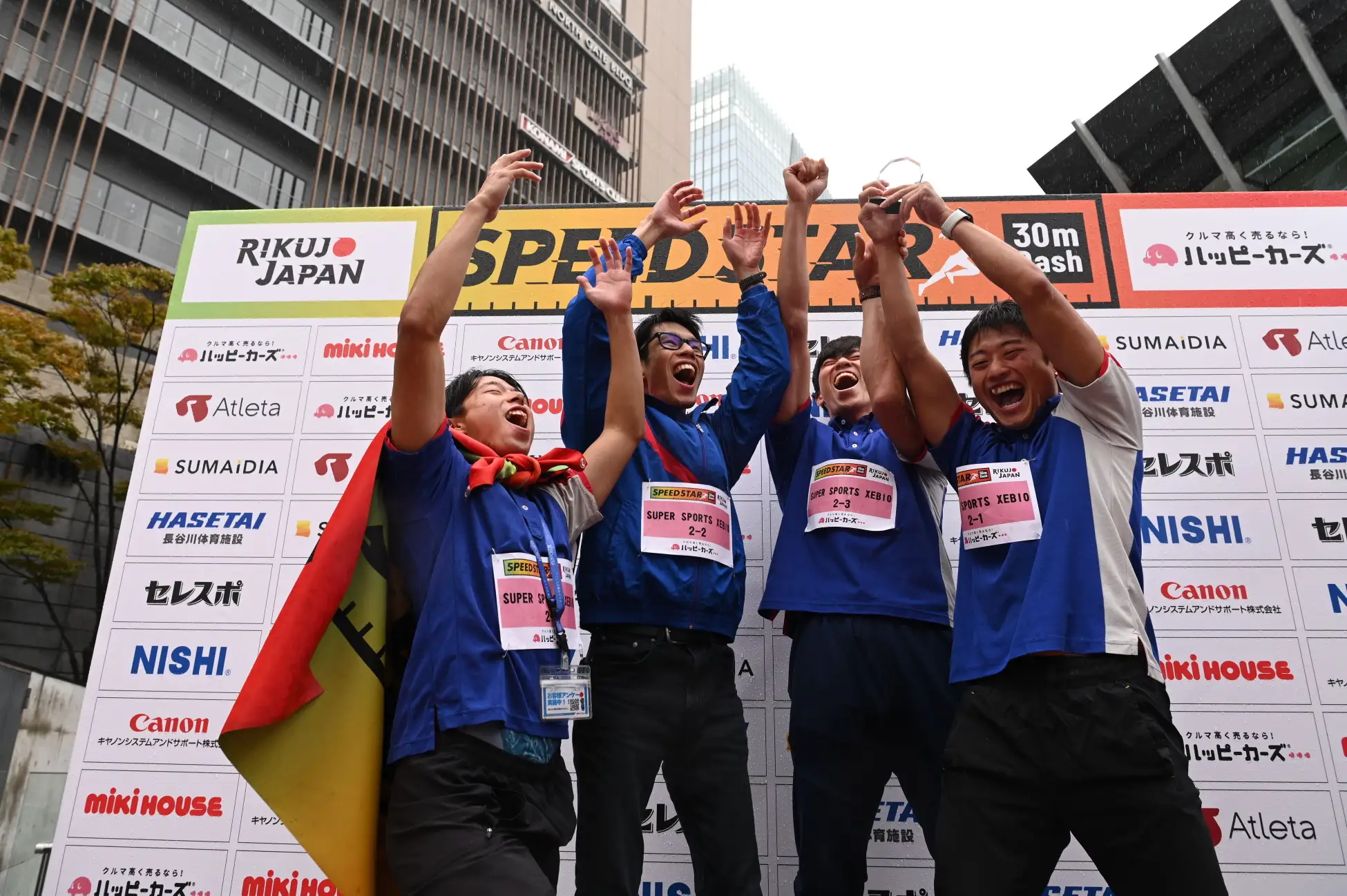 熱戦の末、チーム優勝はスポーツ用品ショップの同僚4名によるチーム「SUPER SPORTS XEBIO」。男子個人タイムトップ3に2名を送り出すハイレベルな走りで合計タイム10秒05を記録し、見事優勝を果たしました。