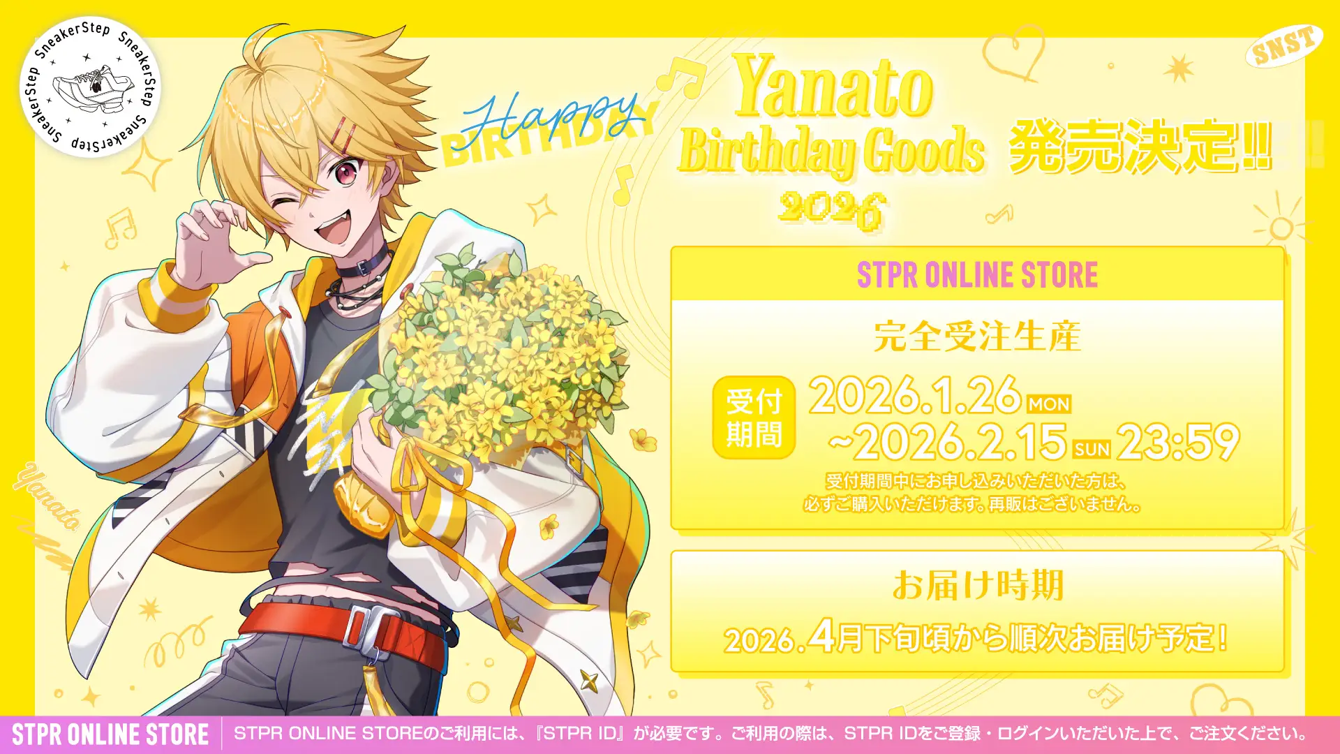 株式会社STPR(本社:東京都渋谷区 代表:柏原真人、以下「STPR」)は、当社所属の2.5次元歌い手アイドルグループ「すにすて – SneakerStep Prod.STPR MUSIC(以下「すにすて」)」メンバー「やなと」の誕生日(1月26日)を記念した「Yanato Birtday Goods 2026」を2026年1月26日(月)よりSTPR ONLINE STORE にて販売開始いたしました。