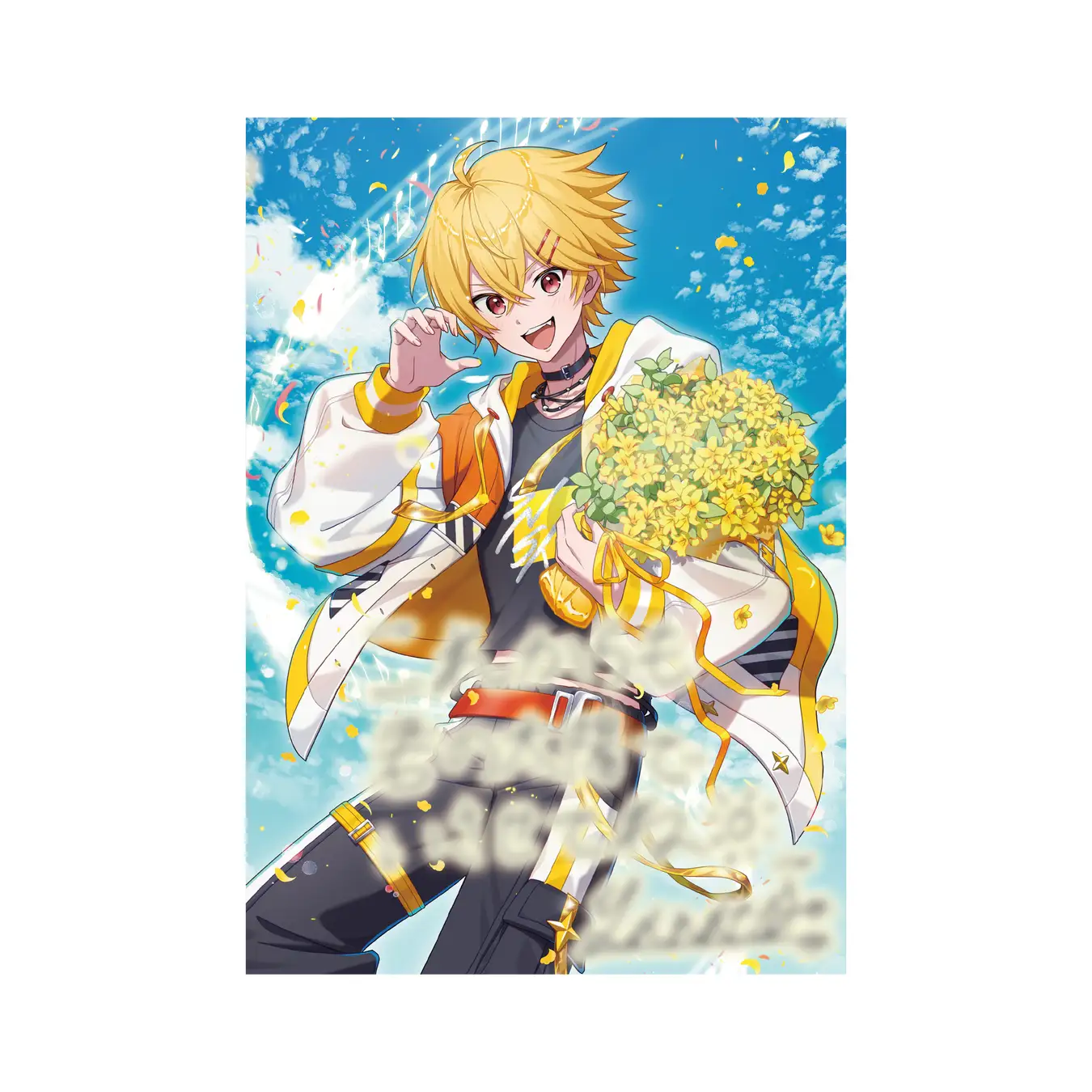 本グッズのビジュアルは、「やなと」の誕生日を記念して特別に描き下ろされたものです。左手にはメンバーカラーであるおひさま色の花束を抱え、右手で可愛らしくほっぺハートを作る「やなと」が描かれています。 このイラストには、日頃の応援への溢れる感謝と、メイツ(ファンの呼称)の皆さんへの深い愛情がぎゅっと込められています。