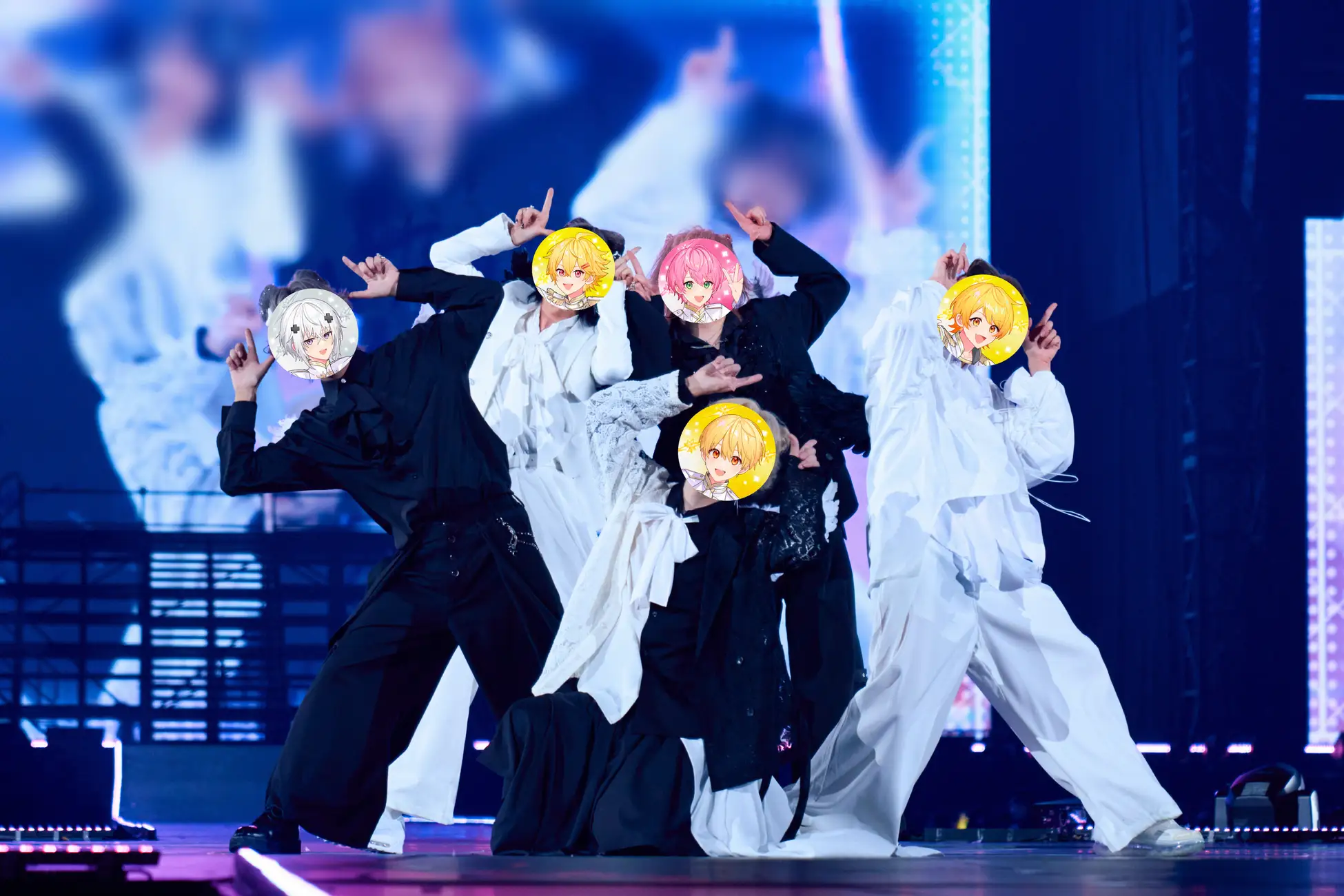 すとぷりのさとみ、騎士 Xのしゆん、AMPTAKのあっと、めておらの心音、みかさくん、明雷らいとによるユニットは、メインステージで騎士 Xの「EDEN」を披露。タイトな黒衣装に身を包み、澄んだハイトーンやファルセット、スタイリッシュなダンスで“楽園”へといざなう6人は、あまりにも凛々しく艶っぽい。
