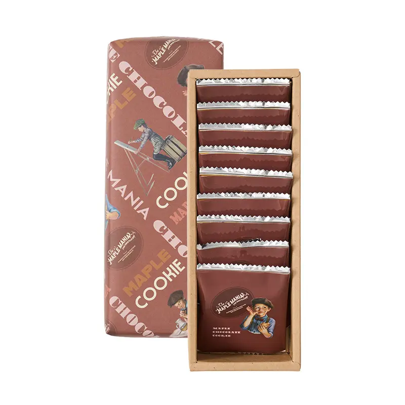 包装紙には、深みのあるチョコレートカラーを採用し、大人の真似をしているメープル坊やに癒される遊び心あふれるデザイン。バレンタインギフトとして、日頃の感謝を伝える贈り物として、おすすめの一品です。この機会にぜひ、サクサク食感とコク深い味わいのメープルスイーツをお楽しみくださいませ。
