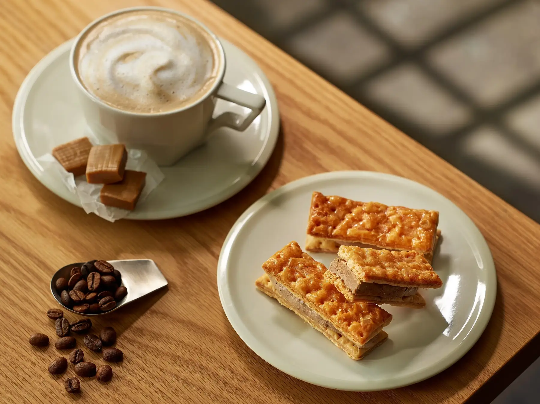 ほろ苦いカカオニブと、キャラメルのコクのある甘みがカフェラテクリームの上品な薫りを引き立てます。香ばしく焼き上げたパイとの食感のハーモニーもお愉しみください。