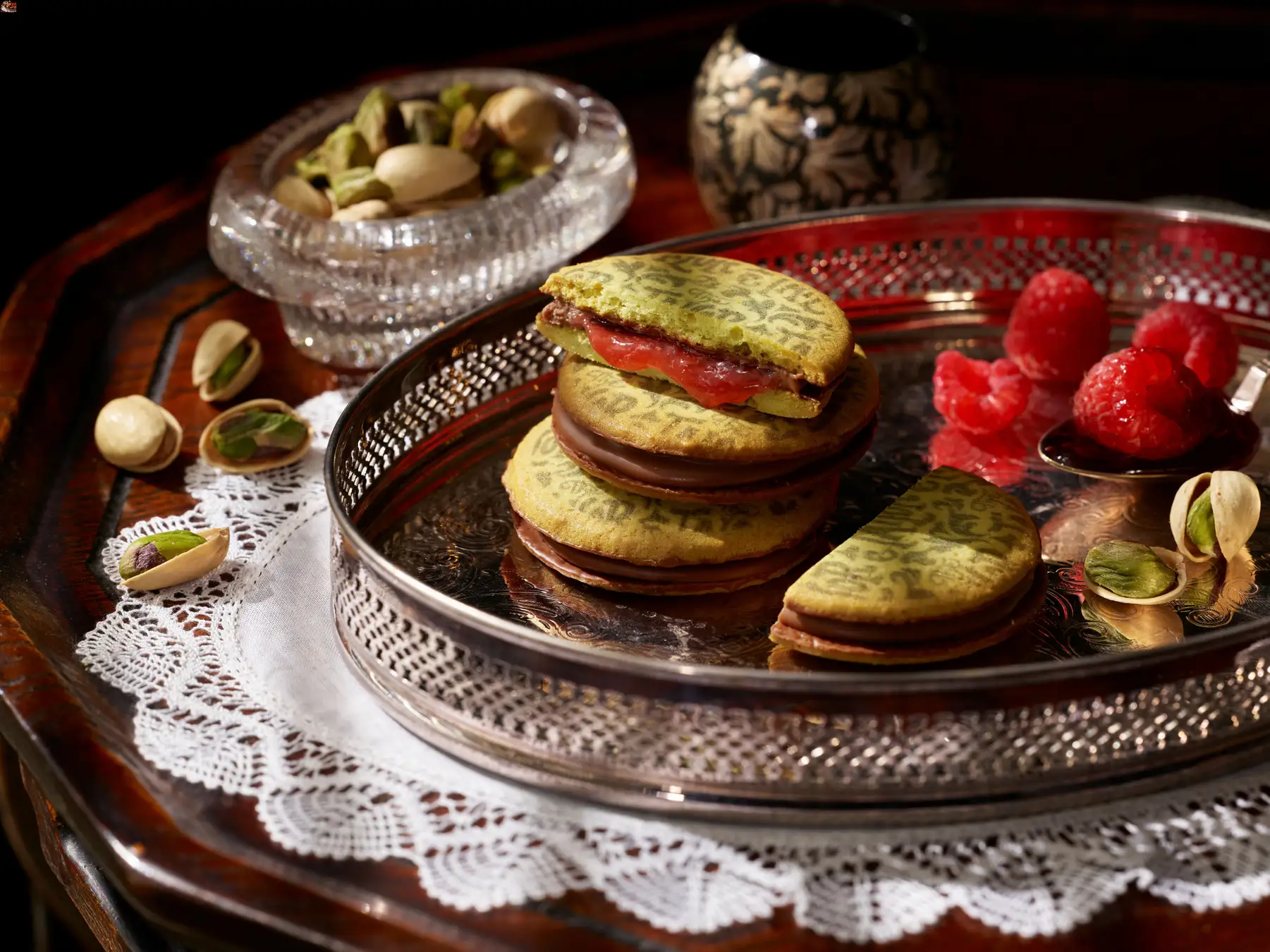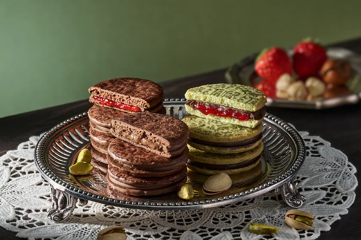 爽やかな酸味を感じるラズベリーソースをミルクチョコレートでコーティングし、さっくりと焼き上げたピスタチオクッキーでサンドしました。ピスタチオの濃厚な旨味と、ラズベリーの爽やかな酸味が織りなすハーモニーは絶妙なバランスでそれぞれを引き立てあう奥深い味わい。美味しさはもちろんのこと、見た目にも彩り美しい一品に仕上げました。