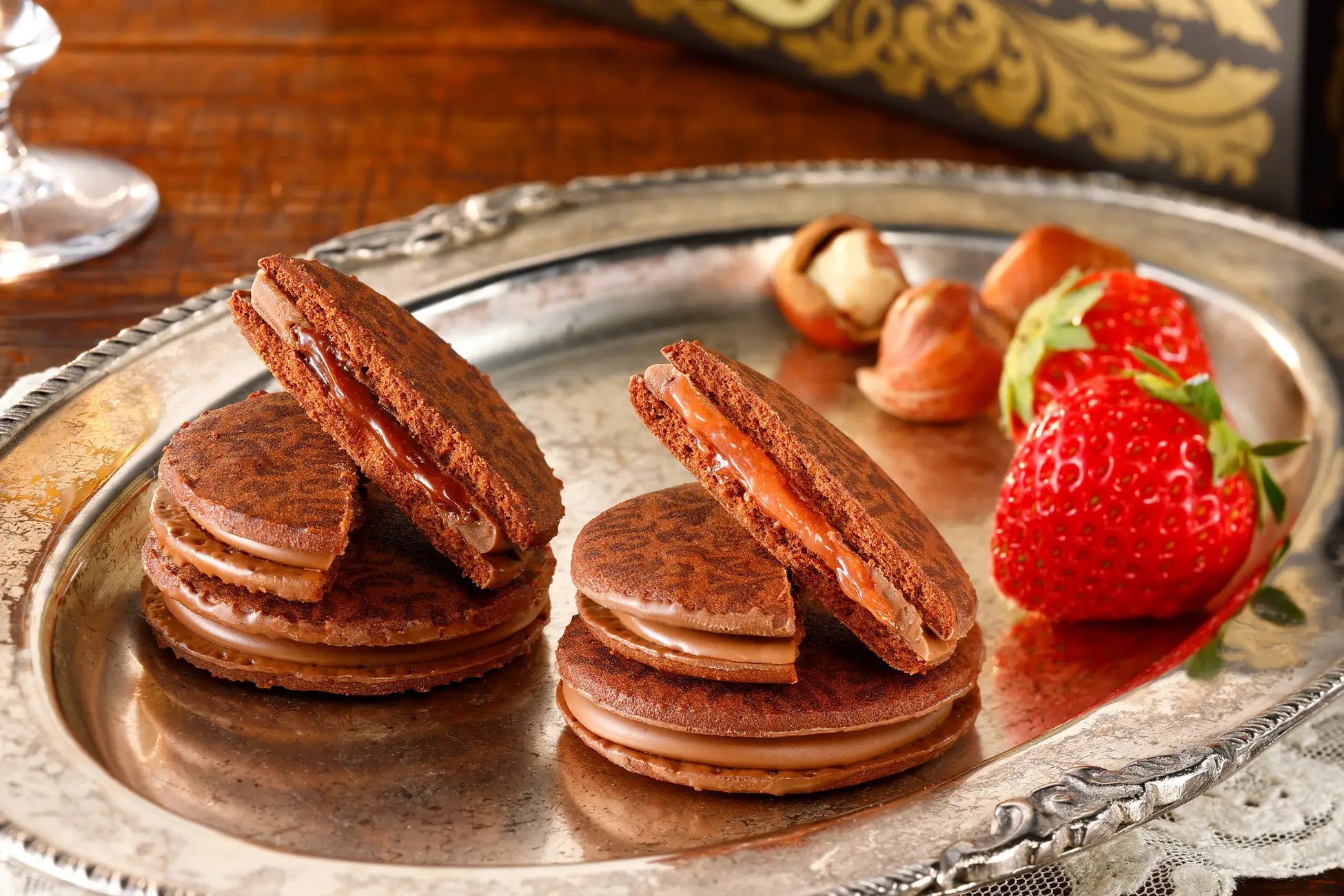 風味豊かな2種類のソースをミルクチョコレートでコーティングし、さっくりと焼き上げたココアクッキーでサンドした、贅沢な味わいのショコラサンドです。 濃厚なヘーゼルナッツクリームと、爽やかな酸味のストロベリーソースの2つの味のアソートで。