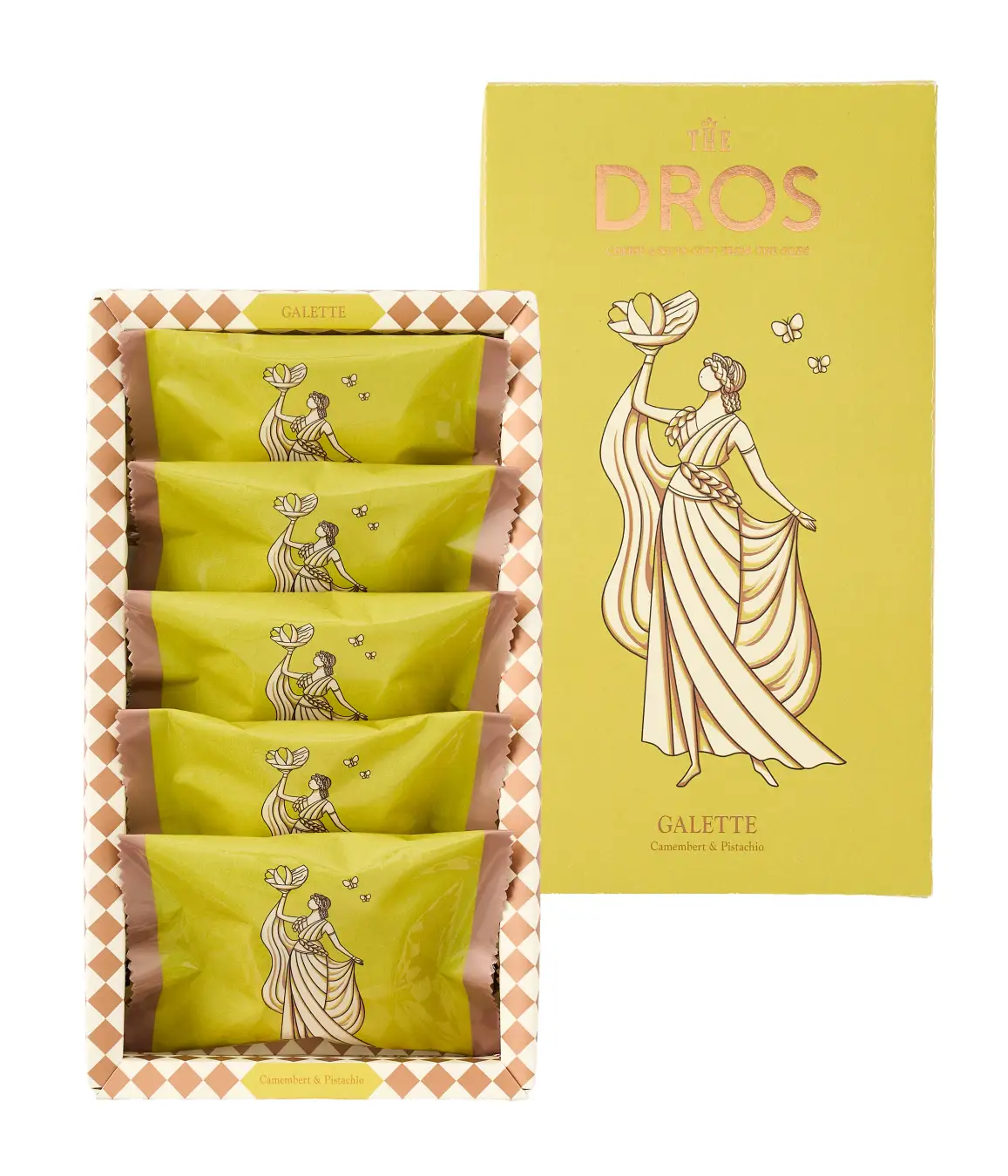 パッケージは、味わい伝わるピスタチオカラーに仕立てました。中央にはTHE DROSの象徴である女神を配し、右手に本商品の主役であるピスタチオとチーズを掲げ、春の訪れを喜ぶ様子を描いています。
