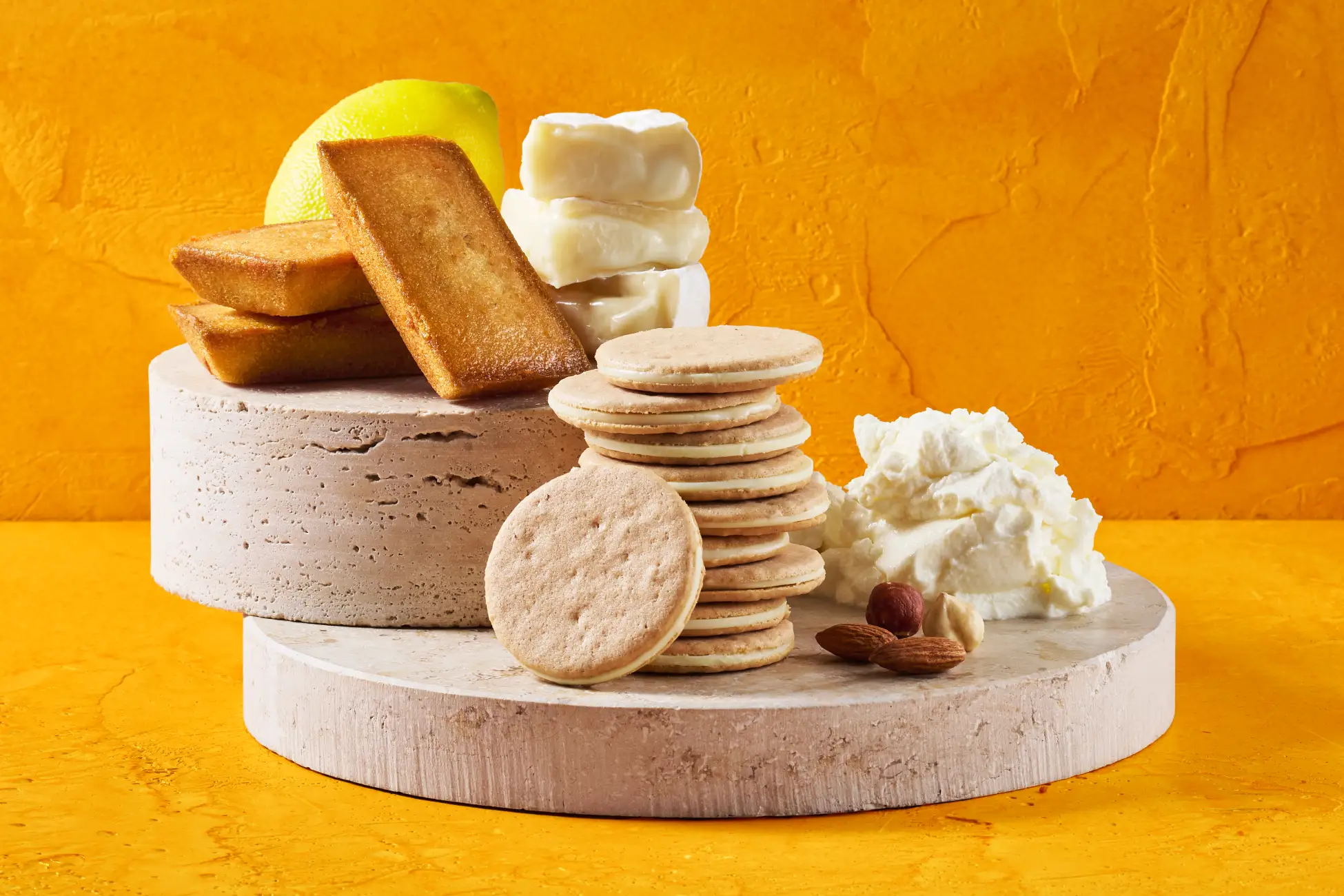 ヘーゼルナッツとプラリネ、沖縄宮古島の雪塩を練り込んだクッキー生地に、マスカルポーネ風味のチョコ(※)をサンドしました。塩味がやさしく引き立てる、甘さとの繊細なバランスに仕上げたクッキーです。