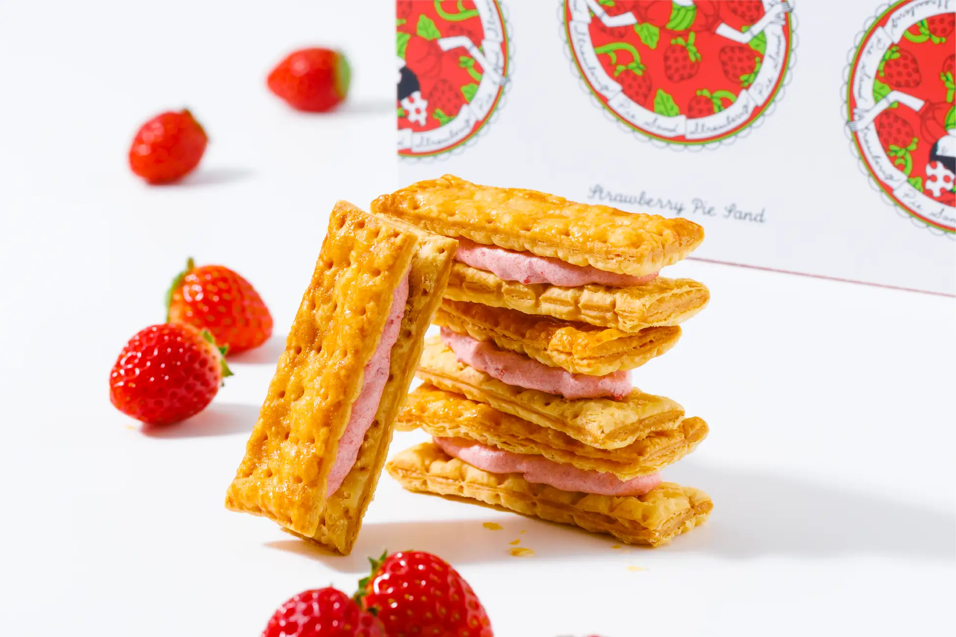 サクッと軽やかなパイ生地に、 甘酸っぱいイチゴの風味をいかした、なめらかなイチゴクリームをサンドしました。クリームには、イチゴ風味のつぶつぶを忍ばせ、食感にアクセントを加えました。