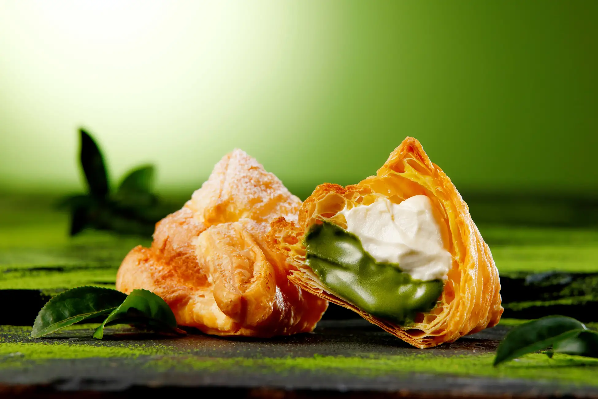 オーブンで焼き上げたサクサクのパイに、抹茶香るほんのり苦みのある“宇治抹茶クリーム”と北海道でつくられた生クリーム、マスカルポーネチーズ、練乳で仕立てた“北海道ミルククリーム”を合わせまし た。