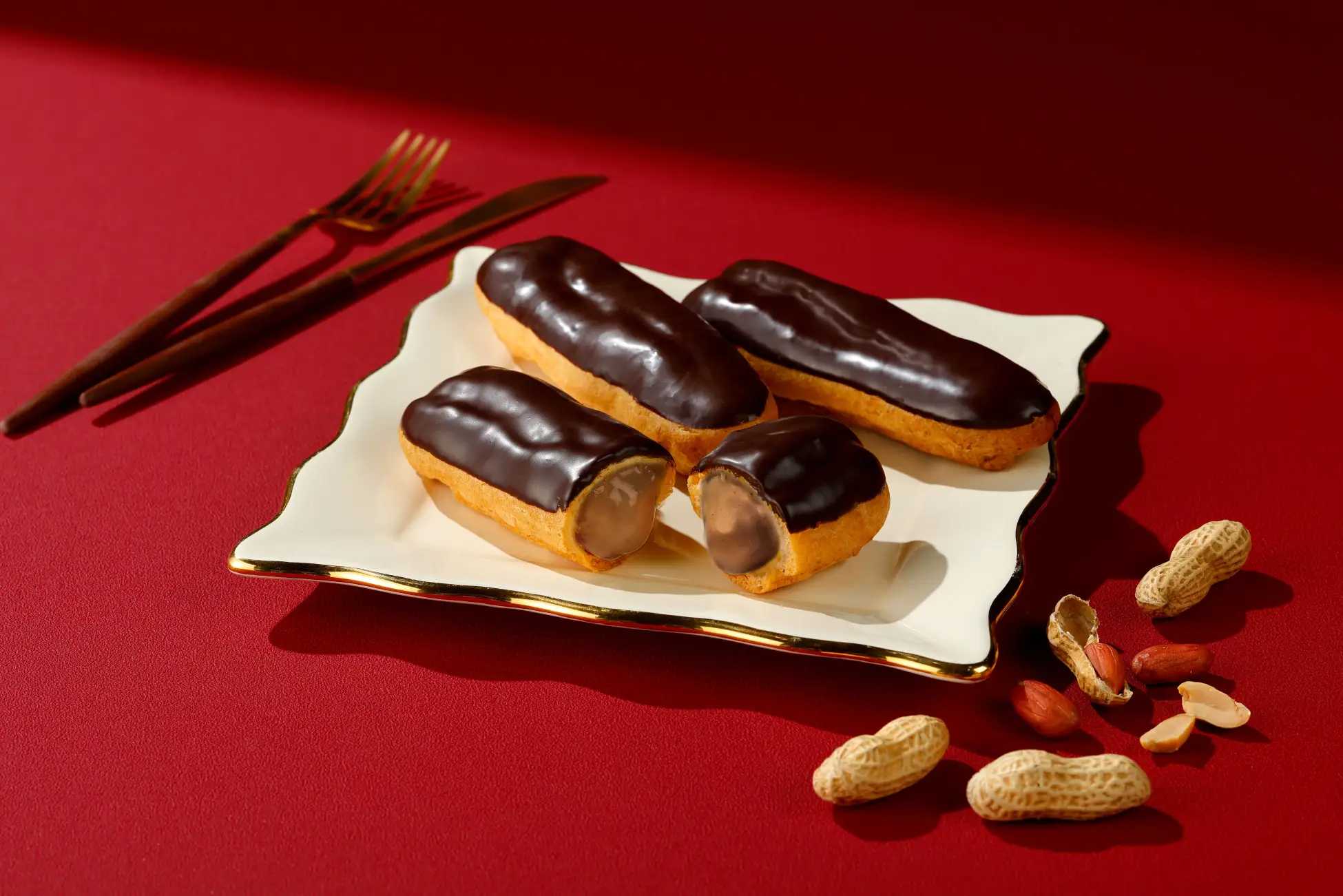 こだわりのクリームには、ピーナッツペーストと生クリームとカスタードクリーム。さらに今年は、チョコレートを加えることで、ピーナッツの風味に加えて、チョコレートの深みが口いっぱいに広がります。クリームのチョコレートとデコレーションしたチョコレートとの”ダブルづかい”により、ピーナッツの美味しさを引き立て、丁度いい甘さで上品な一品に仕上げました。