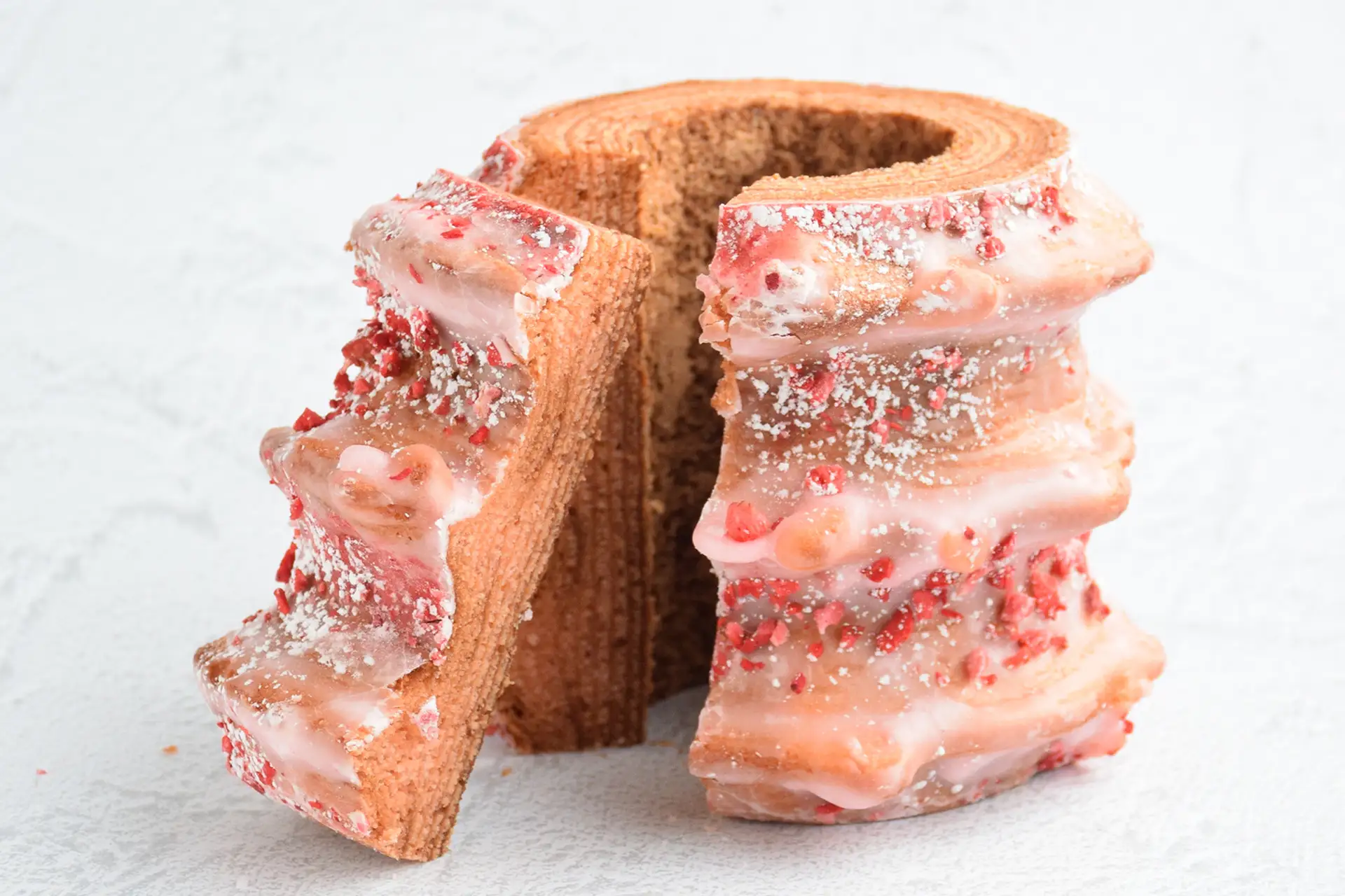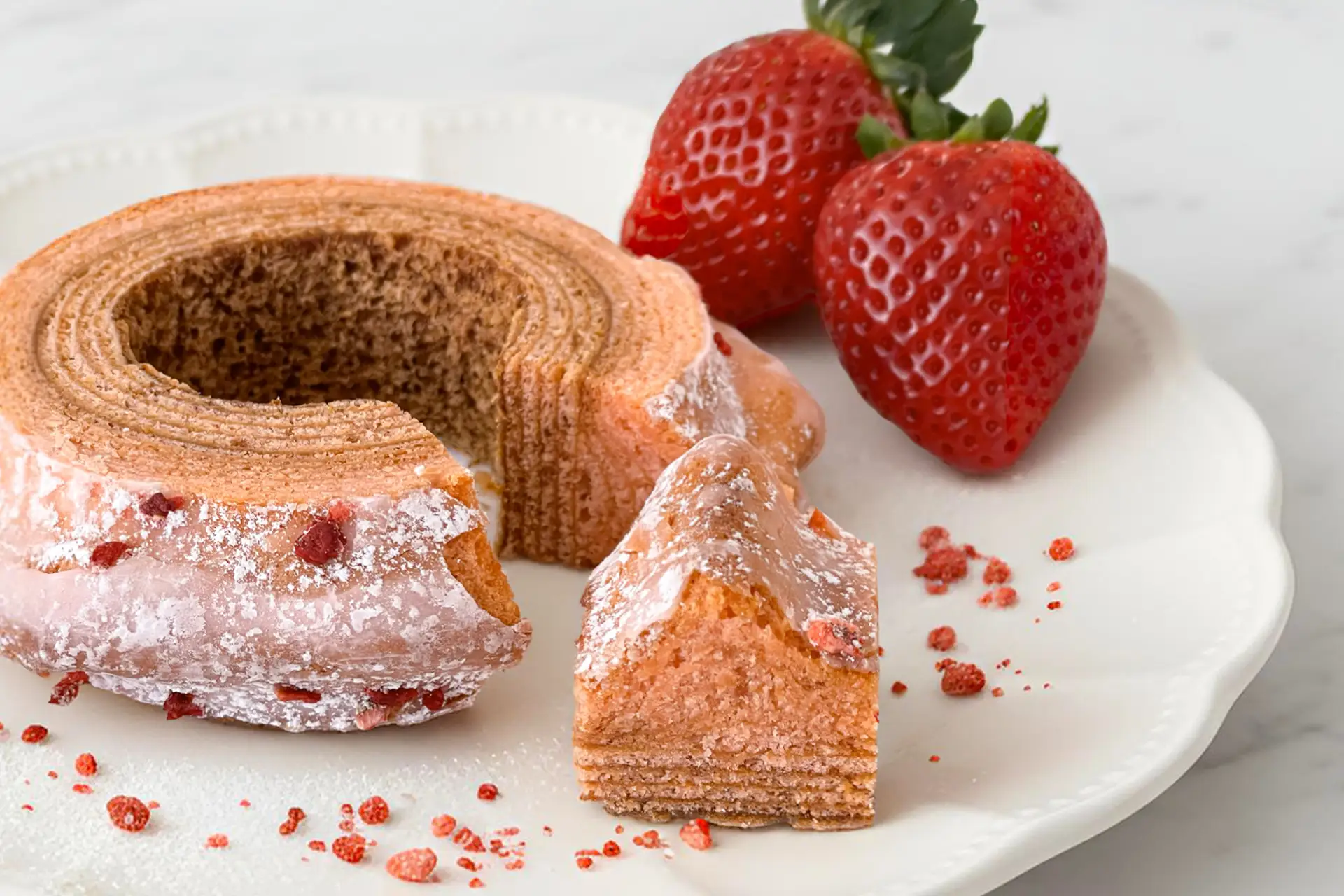 生地とシュガーグラス、それぞれに苺を使うことで、食べる前から香りで、食べ進めるほどに味で感じる贅沢感を演出。苺を“飾り”ではなく、“主役”として活かすためにたどり着いた、今だけの特別なバウムクーヘンです。
