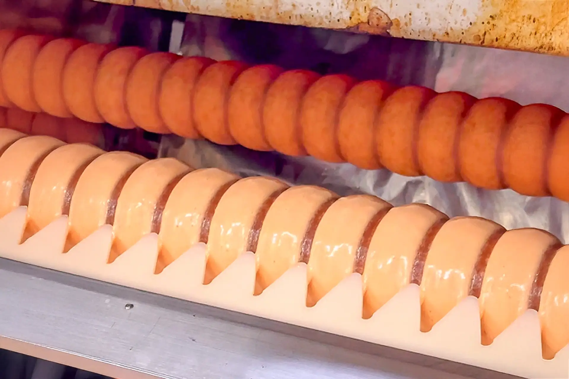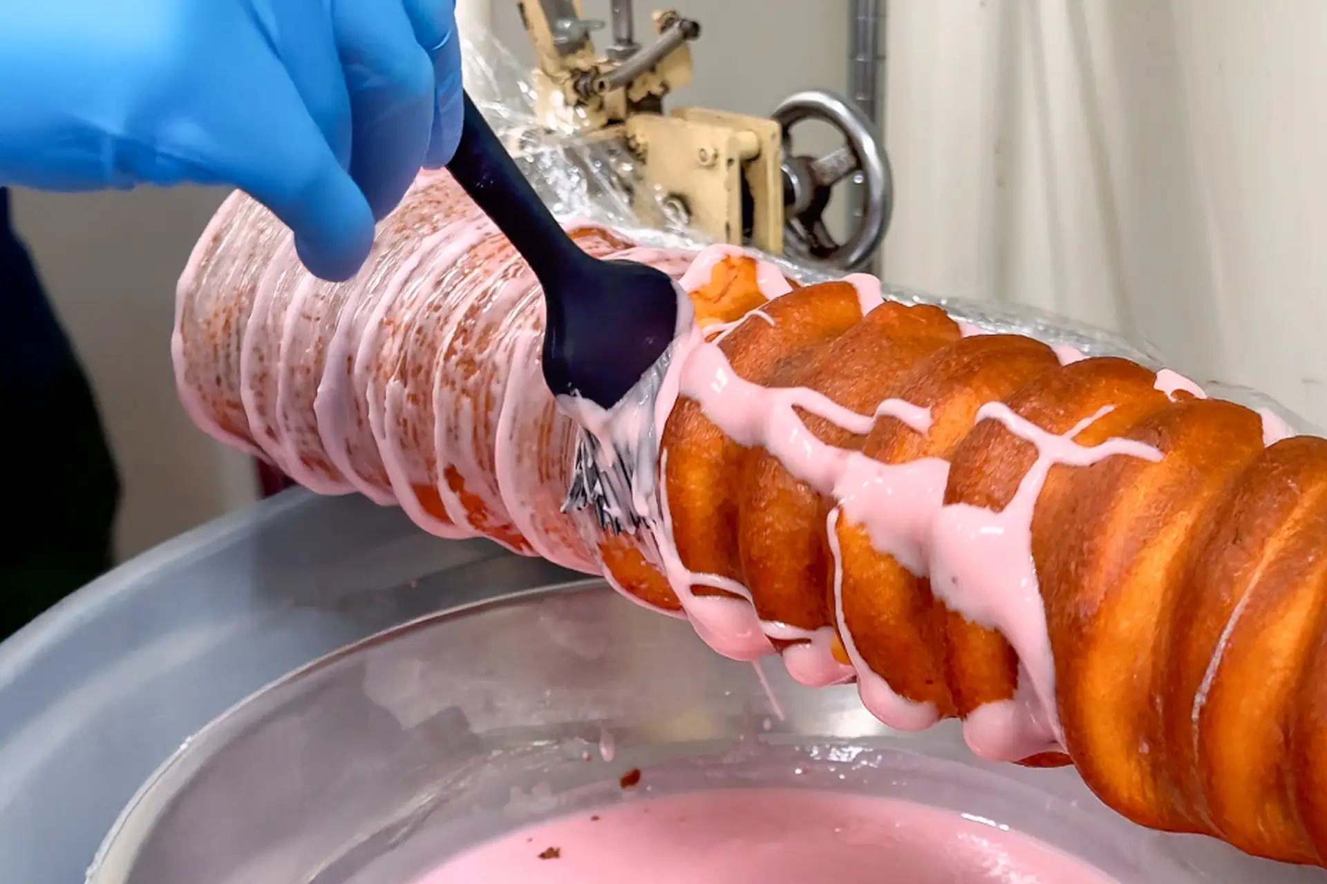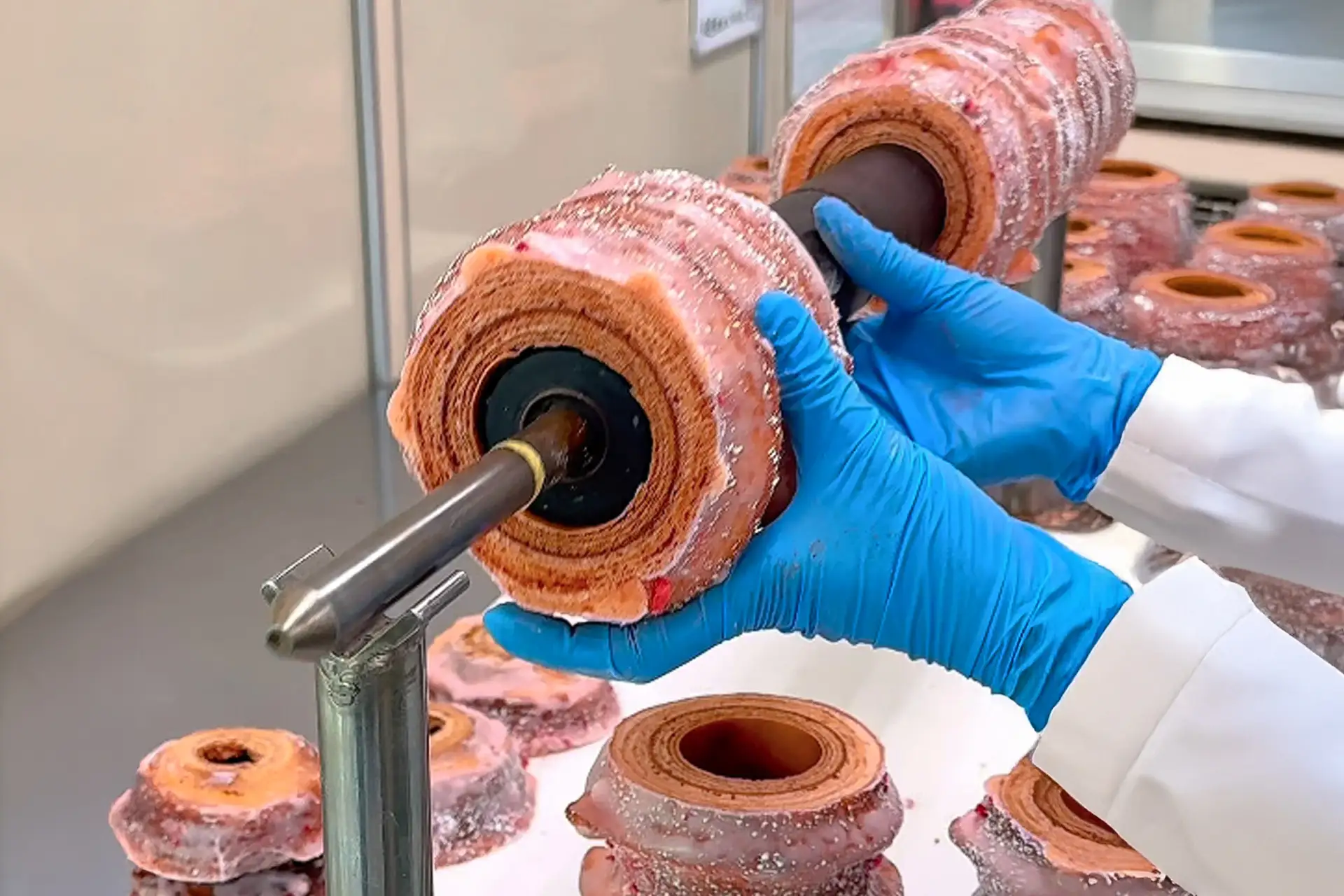 回転する芯棒に生地を巻き付けた後は、成形コームで丁寧に山型に整えます。