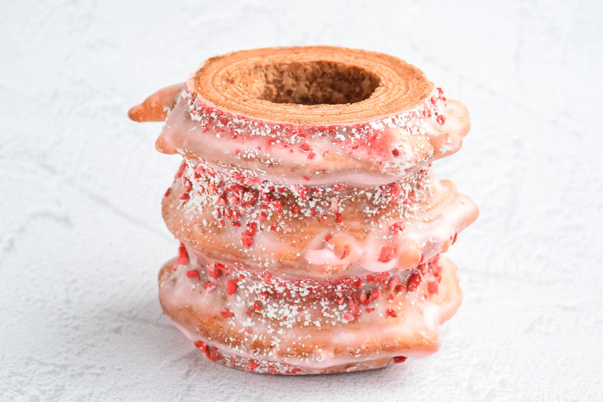 こうして完成したのが――封を開けた瞬間、部屋いっぱいに広がるほどの華やかな苺の香り。ミルキーでやさしい、可愛らしい苺ピンク色。そして、噛むほどに広がる、あまおう苺の甘みと果実感。素材の力を、まっすぐに感じていただけるバウムクーヘンに仕上げました。