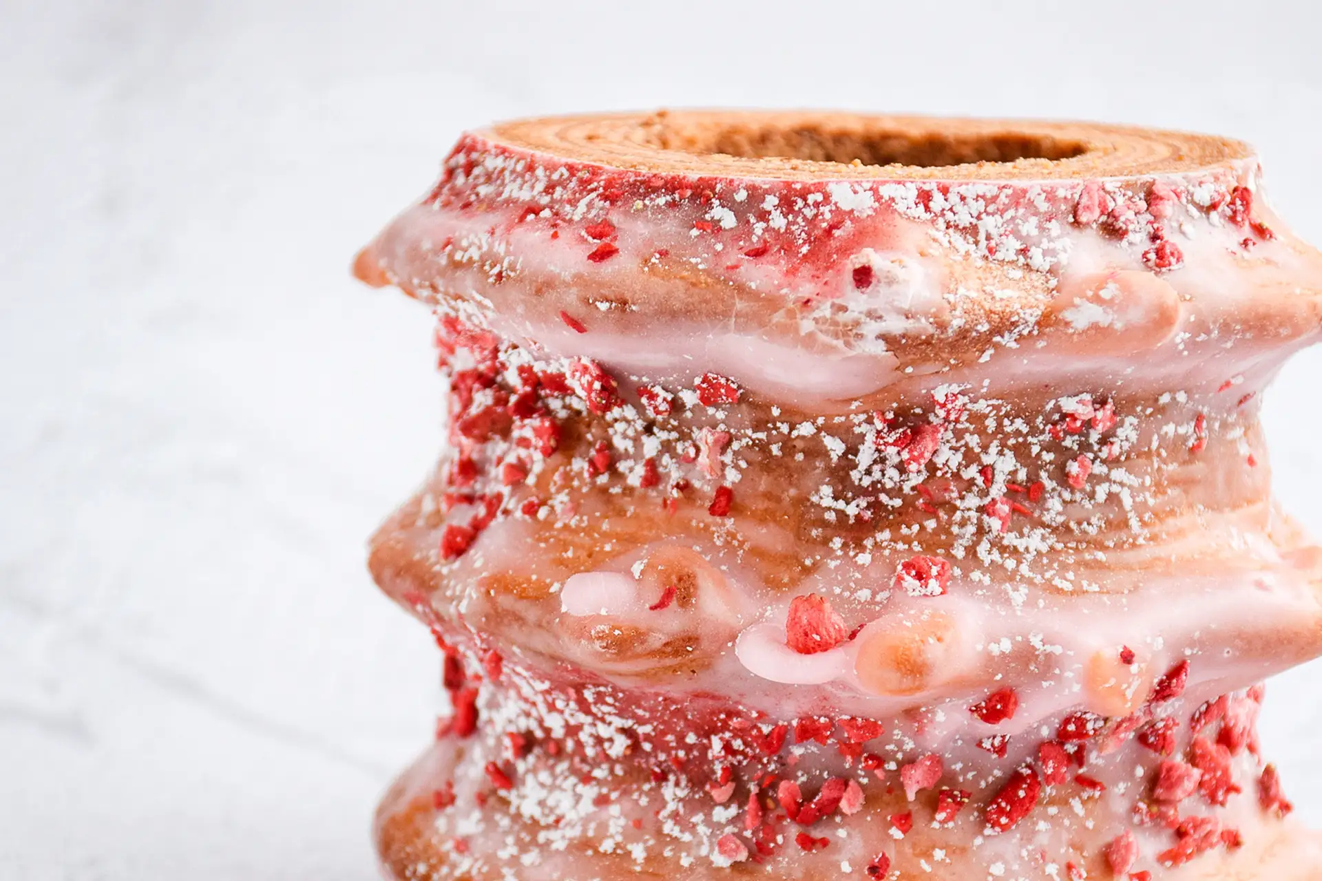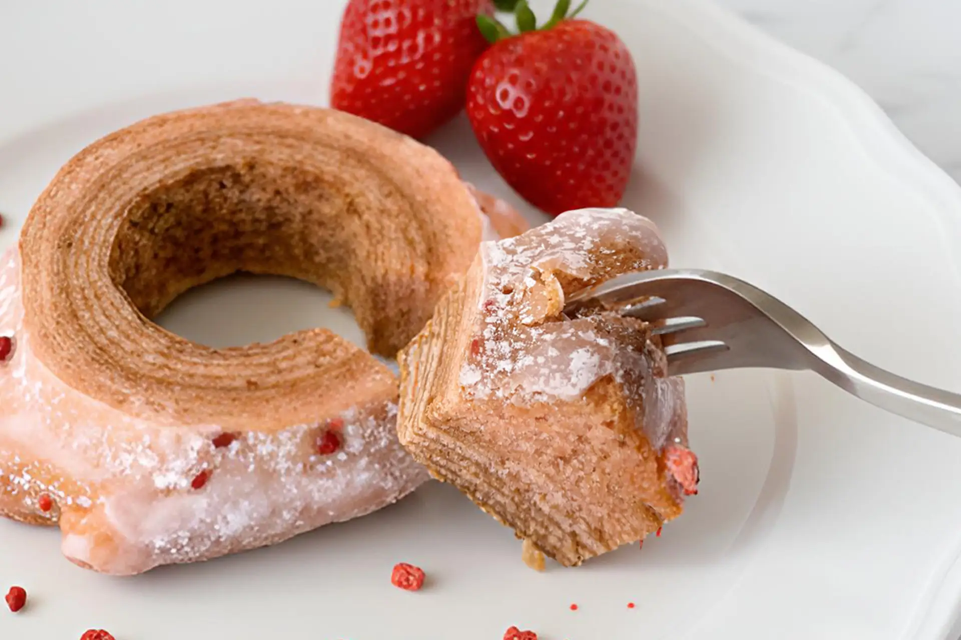 ミルキーピンクのシュガーグラスがシャリッと割れた瞬間、苺の甘酸っぱいニュアンスがふわりと立ち上がり、生地のしっとり感とのコントラストが楽しめます。