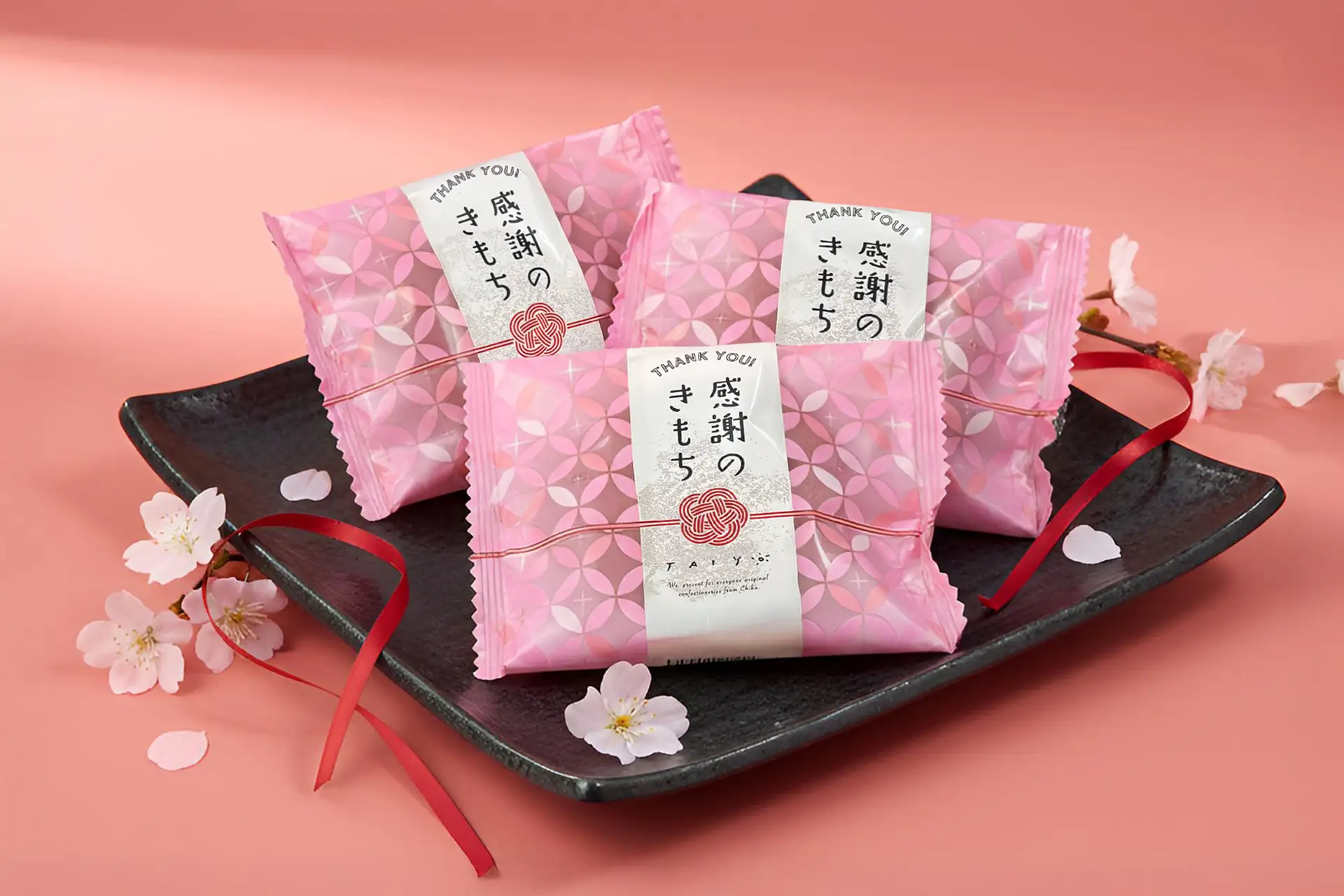 一面にピンクの花をあしらい、のし風に「感謝のきもち」と添えた、バレンタイン限定のたいようオリジナルパッケージ。かしこまったラッピングは不要。これひとつでギフトが完成します。