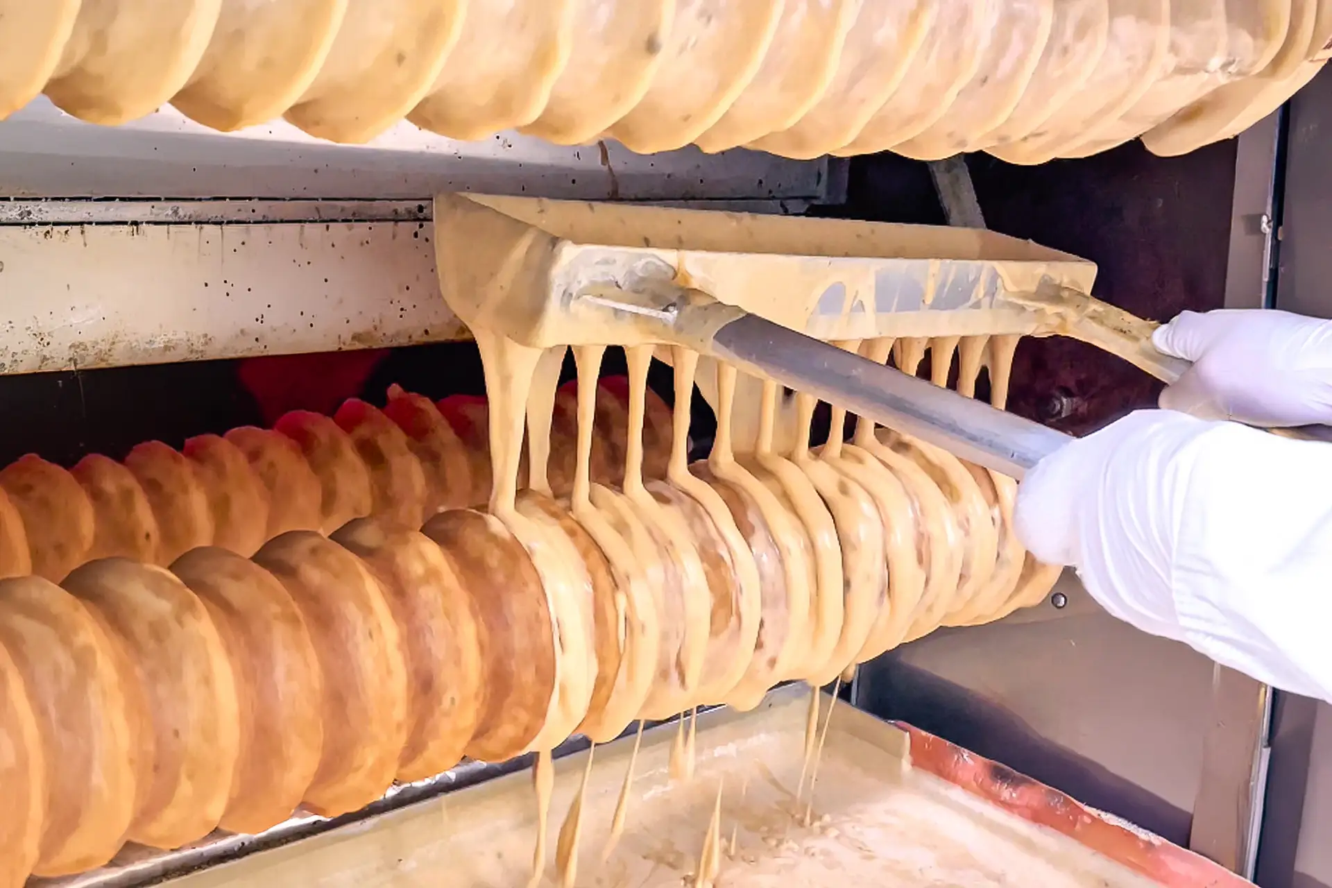 お菓子のたいようでは、その雄大な山脈をイメージし、高速回転させながら焼き上げる独自製法により、飛び散った生地が山肌のような層を描く、力強い表情のバウムクーヘン「ブレヴァン」を作り上げました。遠心力によって引き伸ばされた生地は、自然と美しい凹凸を生み出し、まるで山の峰のような迫力ある造形に。この凹凸がしっかりと焼き締められることで、外側は“サックリ”としたハードな食感、内側は層が密に重なり“もっちり”食感に仕上がります。