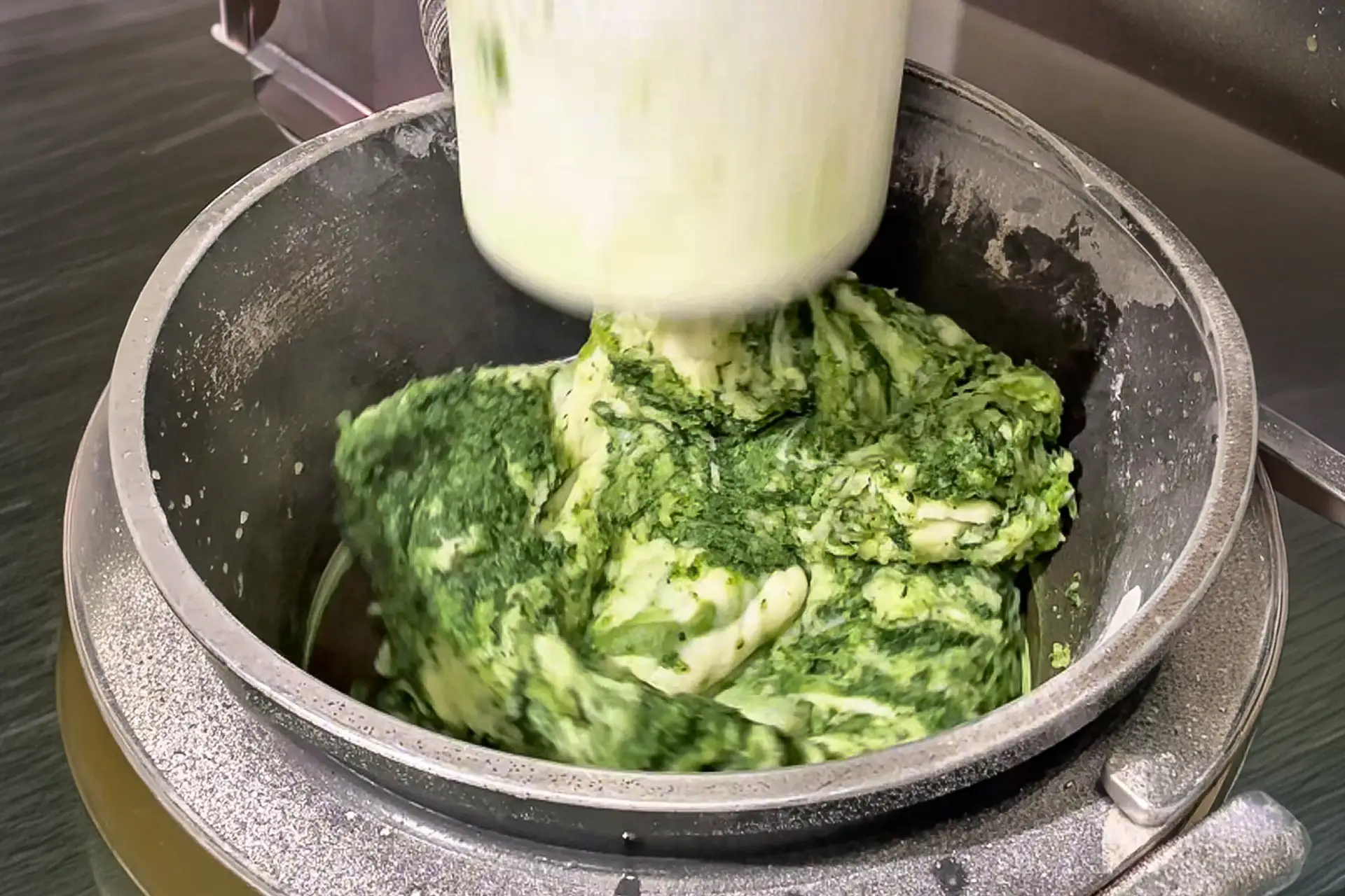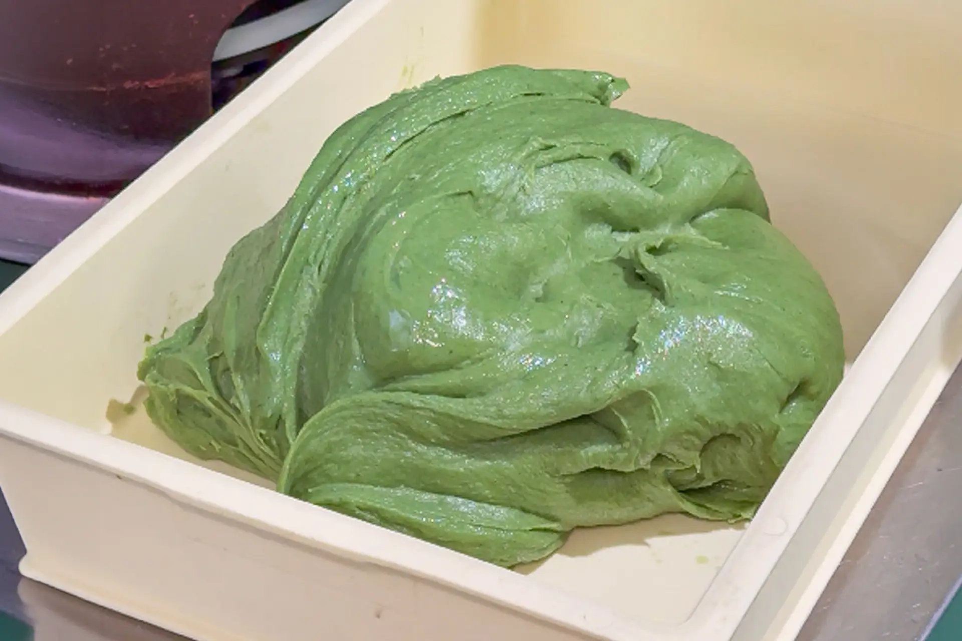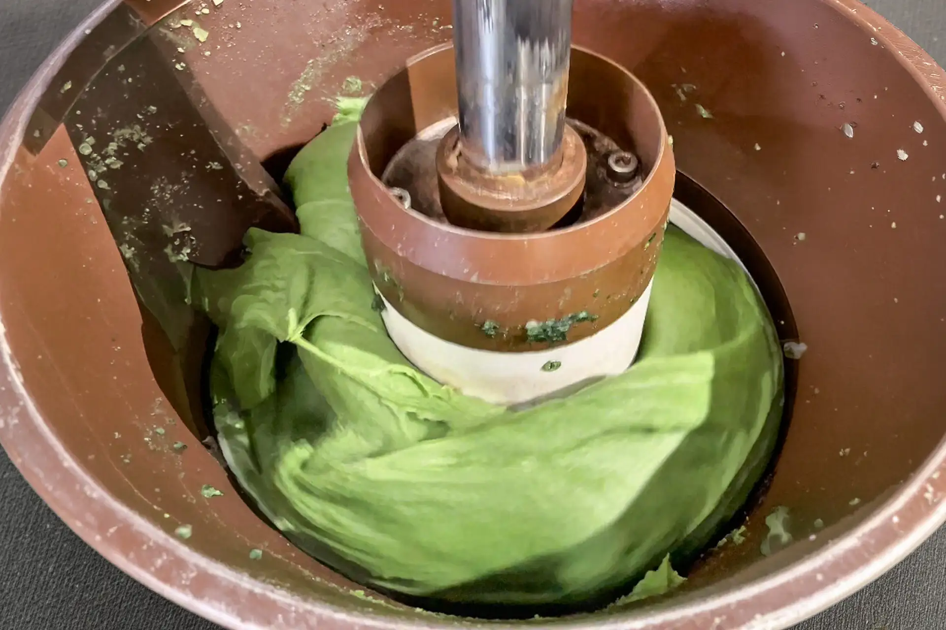 よもぎは素材の質によって色合いが大きく変わります。質の高いよもぎほど、深く鮮やかな緑色に。蔵王のよもぎは、まさにその象徴。ご覧の通り、目にも美しい鮮やかな緑色です。