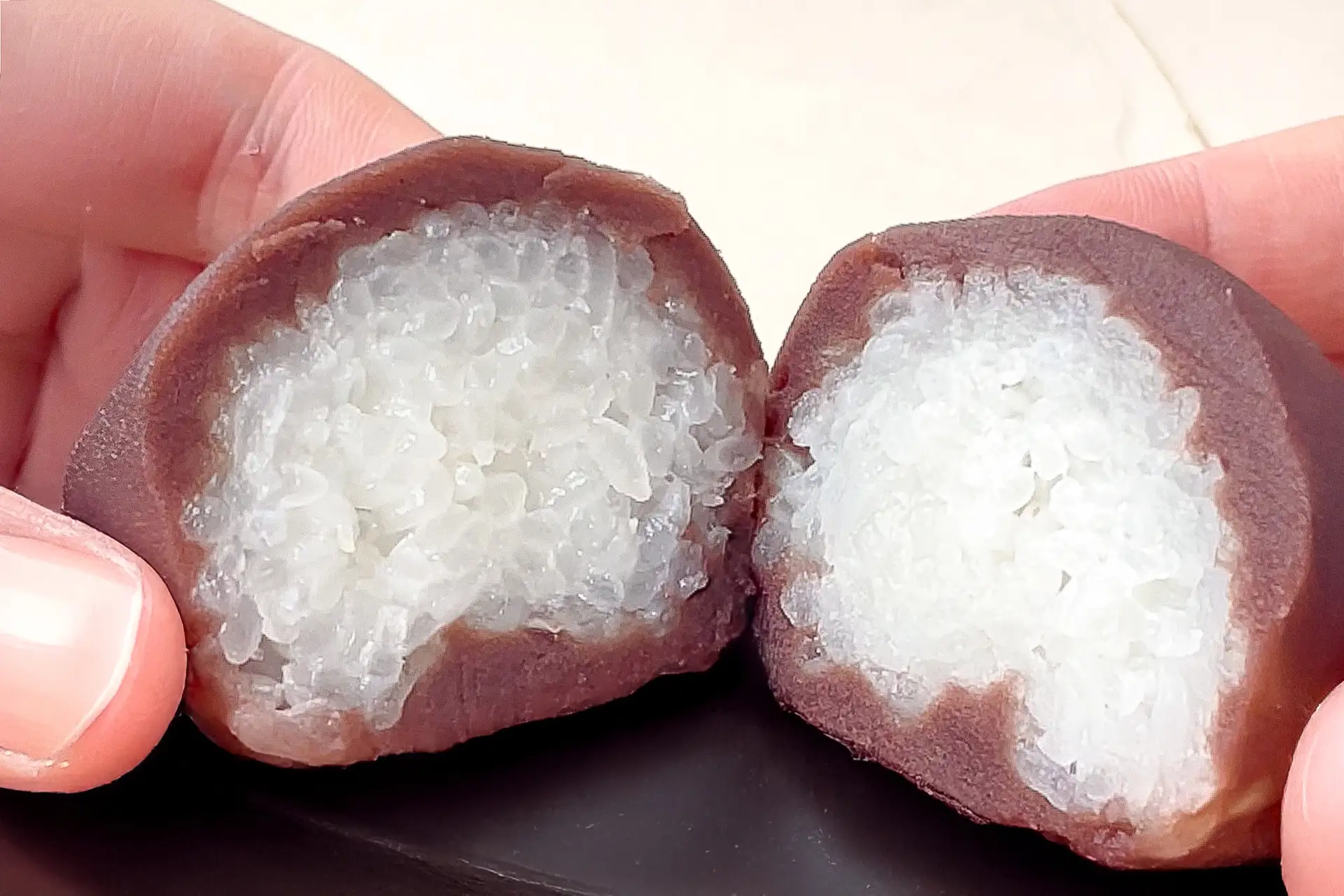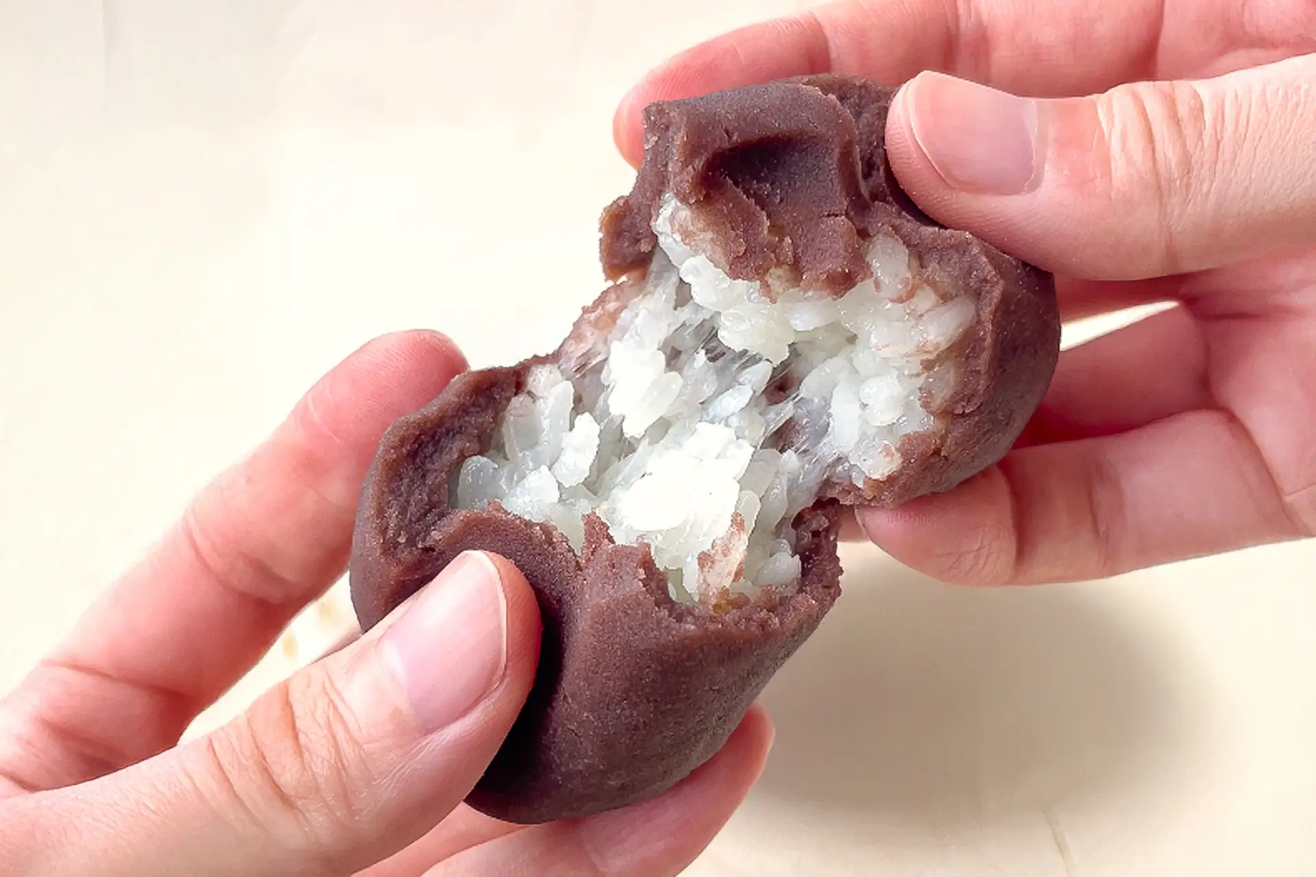 上質なもち米のほのかな甘みと、こし餡の上品なコクが重なり、噛むたびにじんわりと旨味が広がります。この粘りがあるもち米だからこそ、こし餡がしっかりと絡みつきます。