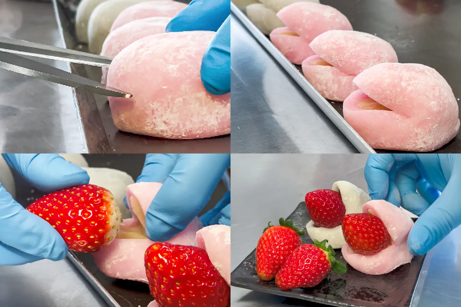 一般的な苺大福の餅は、やわらかさを最優先にするあまり、苺と餡をつなぐ“脇役”になりがちです。