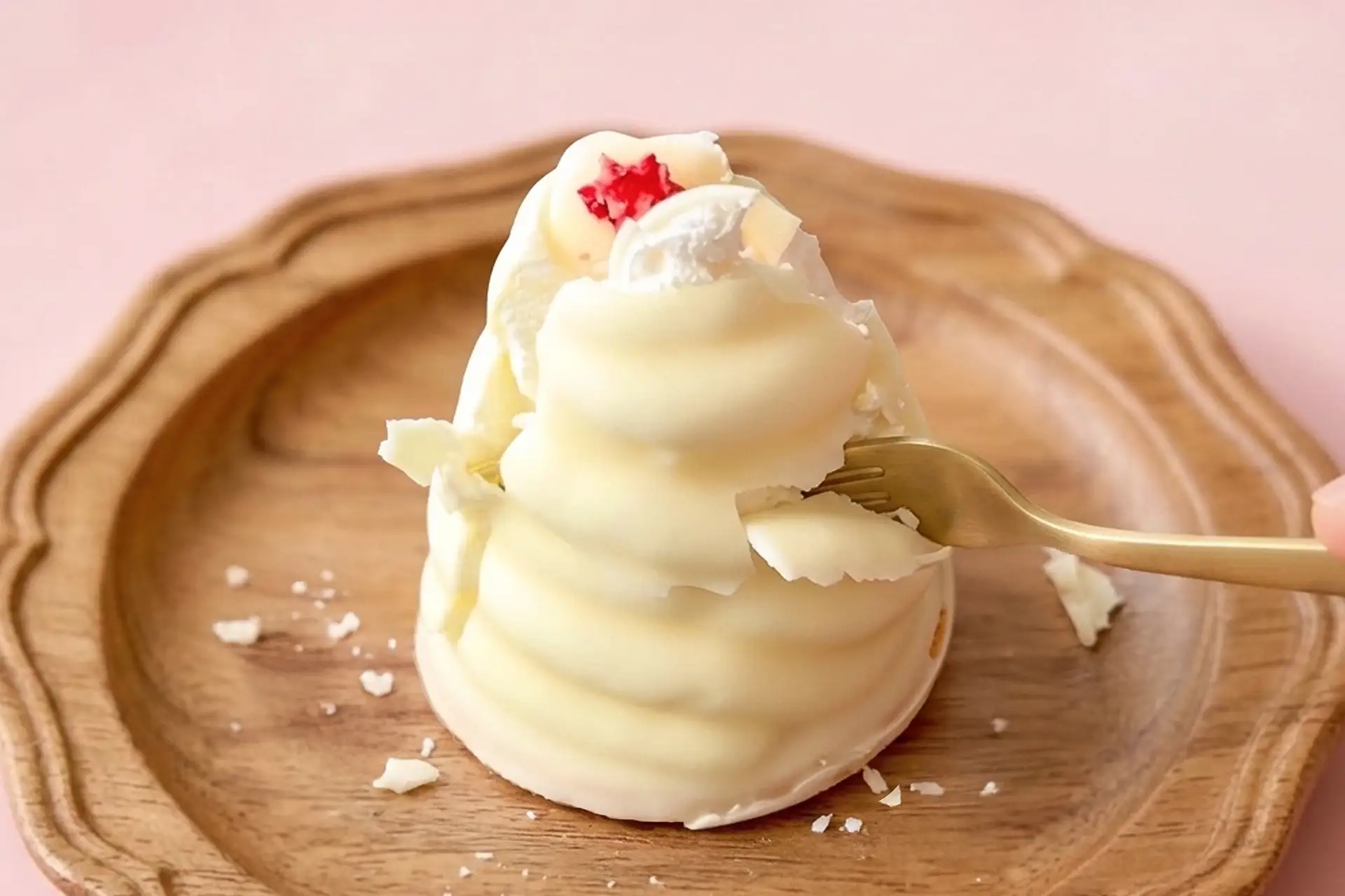 計算し尽くされたなめらかな舌触りは、口の中で一切のざらつきを残さず、美しくとけていく──。チョコが主張しすぎるのではなく、クリームと溶け合い、刹那に放つ「パリッ」という快音をアクセントにしながら、最後は一体となって消えていく。これこそが、比類なき“とろけるショートケーキ感”を生み出す最大の秘密です。
