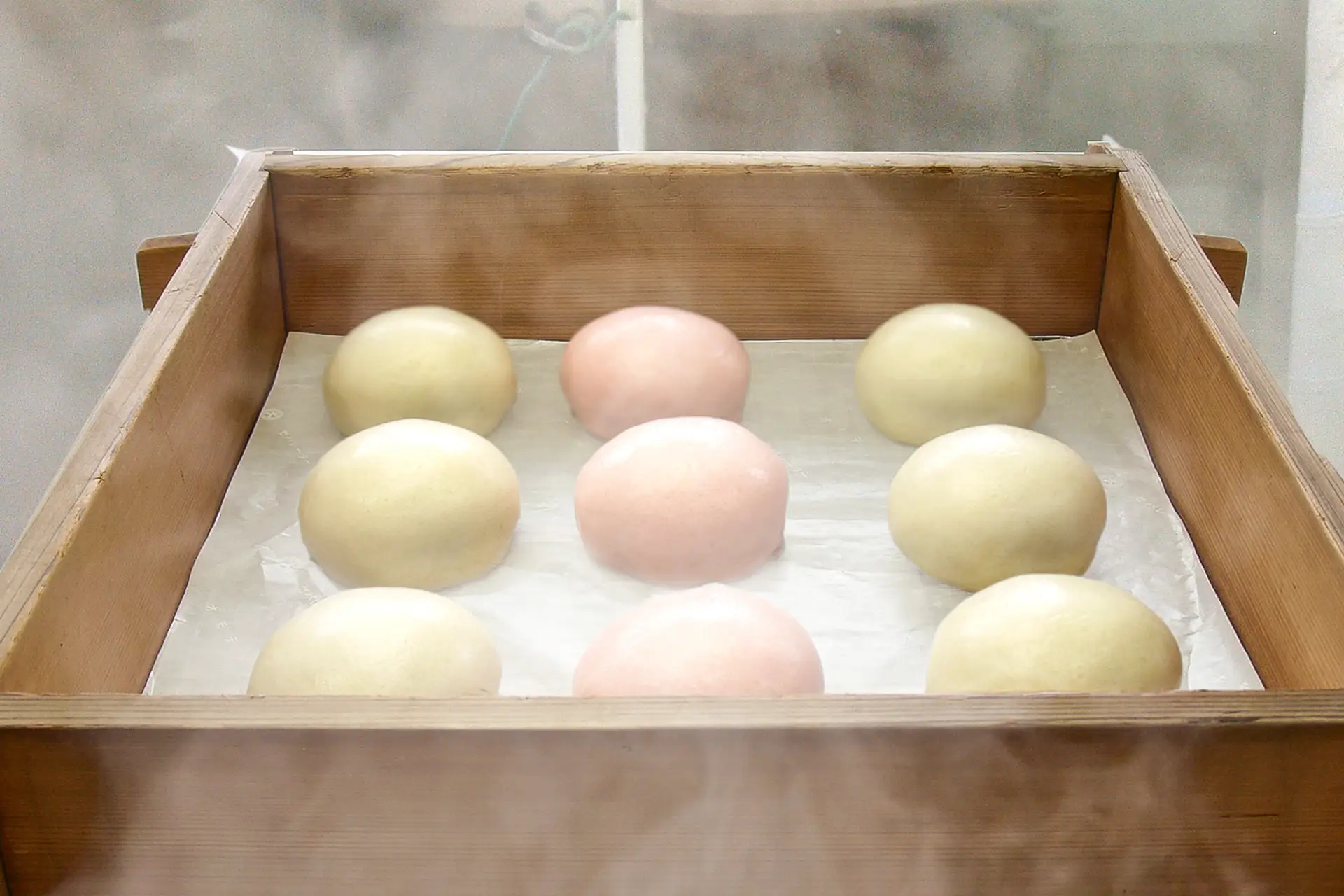 高温の蒸気でやわらかく膨らんだ生地は、中の餡をそっと包み込みます。