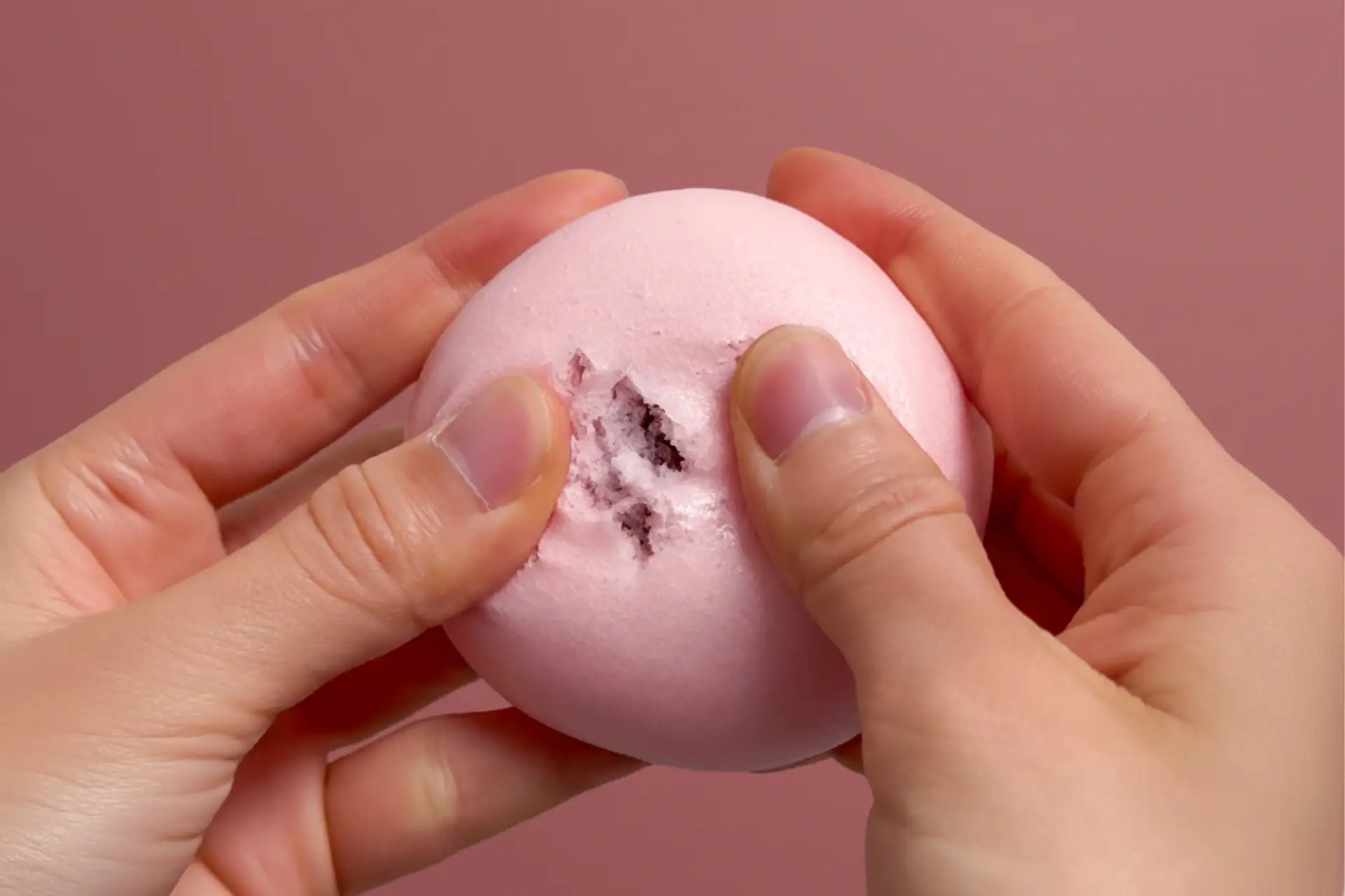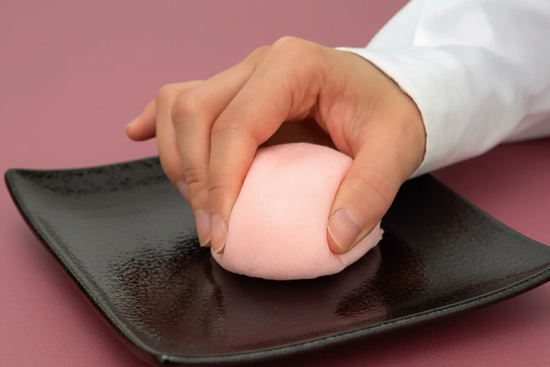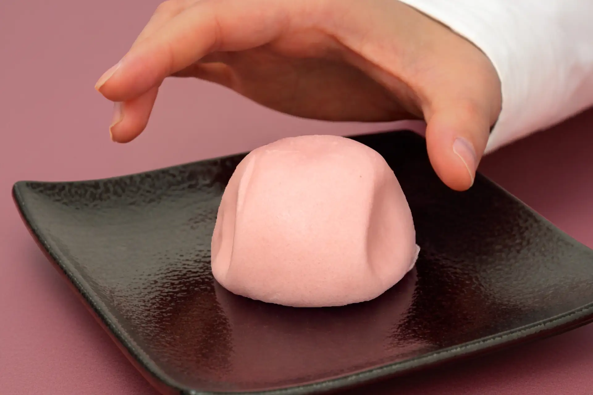 たいようの紅白まんじゅうは、指を添えると、驚くほどしっとりと、深く沈み込んでいきます。