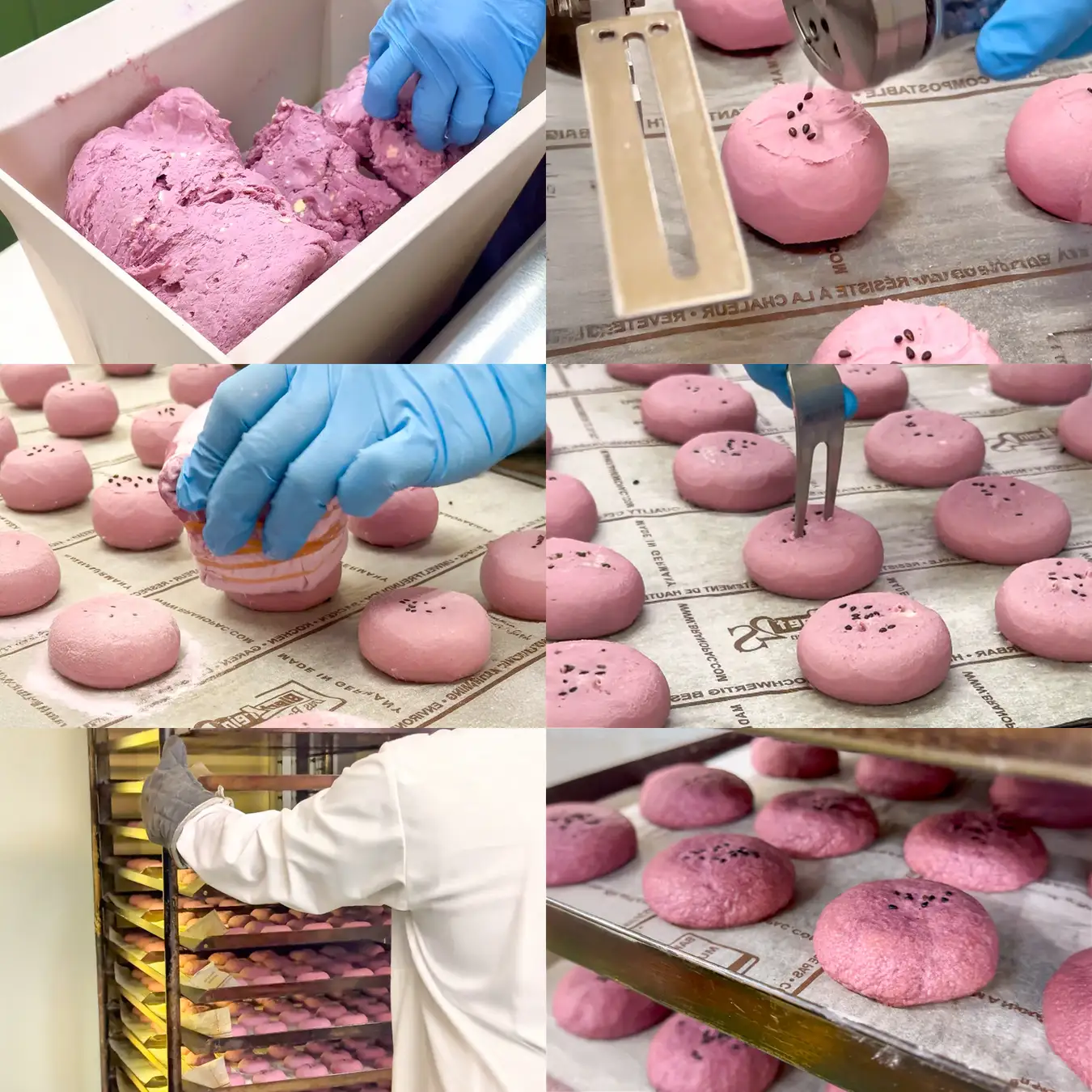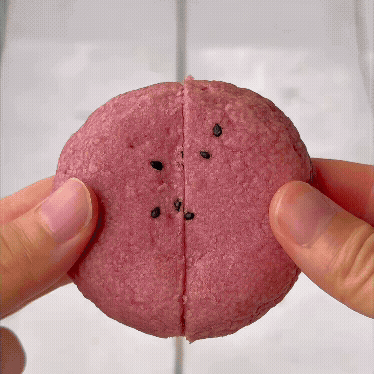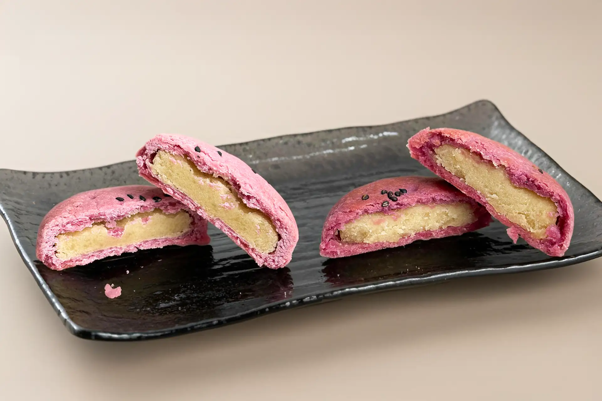 楕円フォルムだったパイは、ころんと愛らしい丸形にリニューアル。さらに、表面にまぶすだけだったオリジナル紫芋パウダーを、パイ生地そのものにたっぷりと練り込み、色・香り・味わいすべてを底上げしました。仕上げには黒ごまをあしらい、香ばしさと見た目のアクセントをプラス。鮮やかな紫色のパイ生地で、濃厚な黄色い芋餡を包み込んだその姿は、ひと目で「芋!」と感じられるビジュアルと味わいへと進化しています。