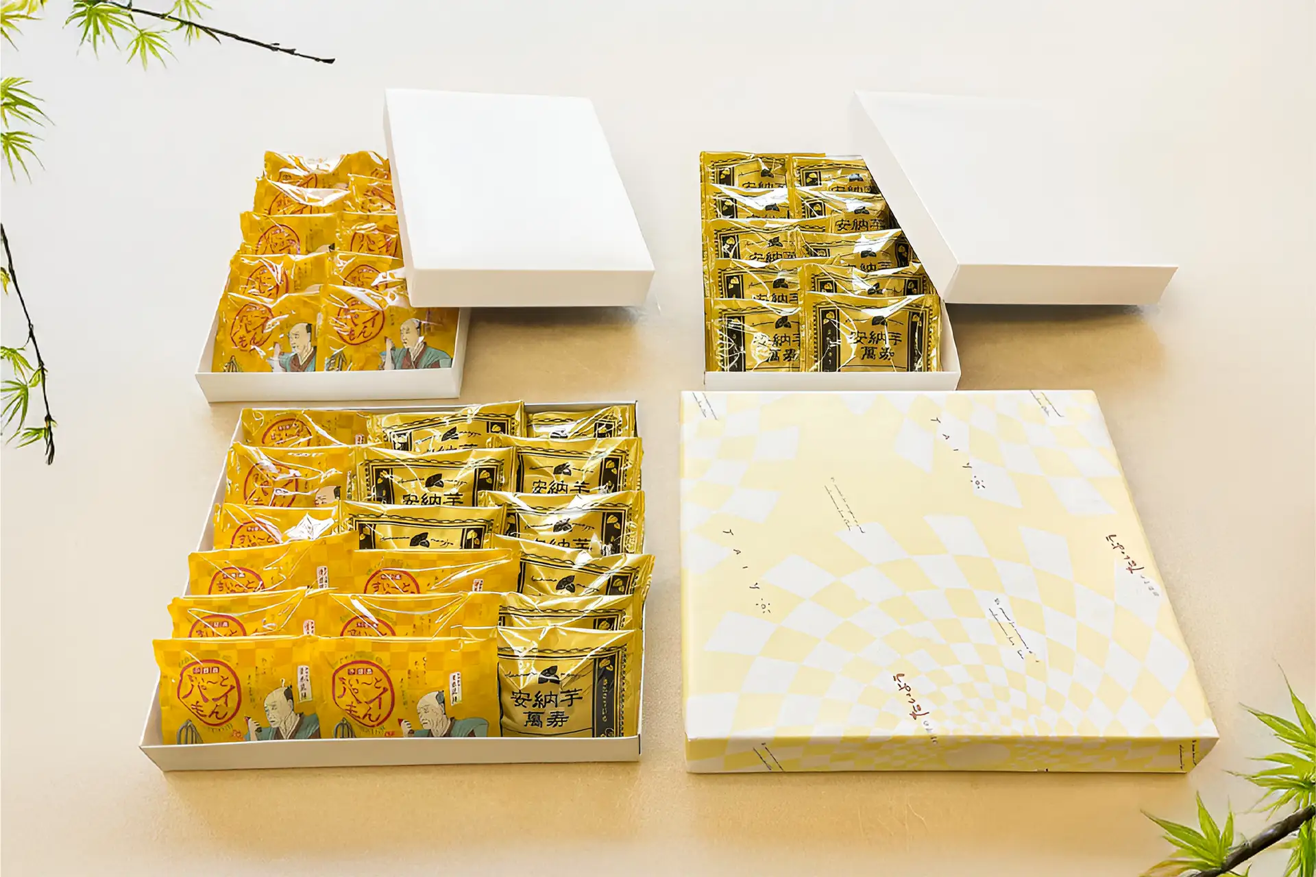 安納芋の蜜を思わせる艶やかな“黄金色”で仕立て、ひと目で印象に残る、存在感のある色合いです。和の趣を感じさせる落ち着いたデザインに、金色を基調とした配色を重ねることで、焼き芋のようなぬくもりと、手土産にも映える上質感を両立。派手すぎず、それでいて確かな特別感を感じさせる佇まいに仕上げました。