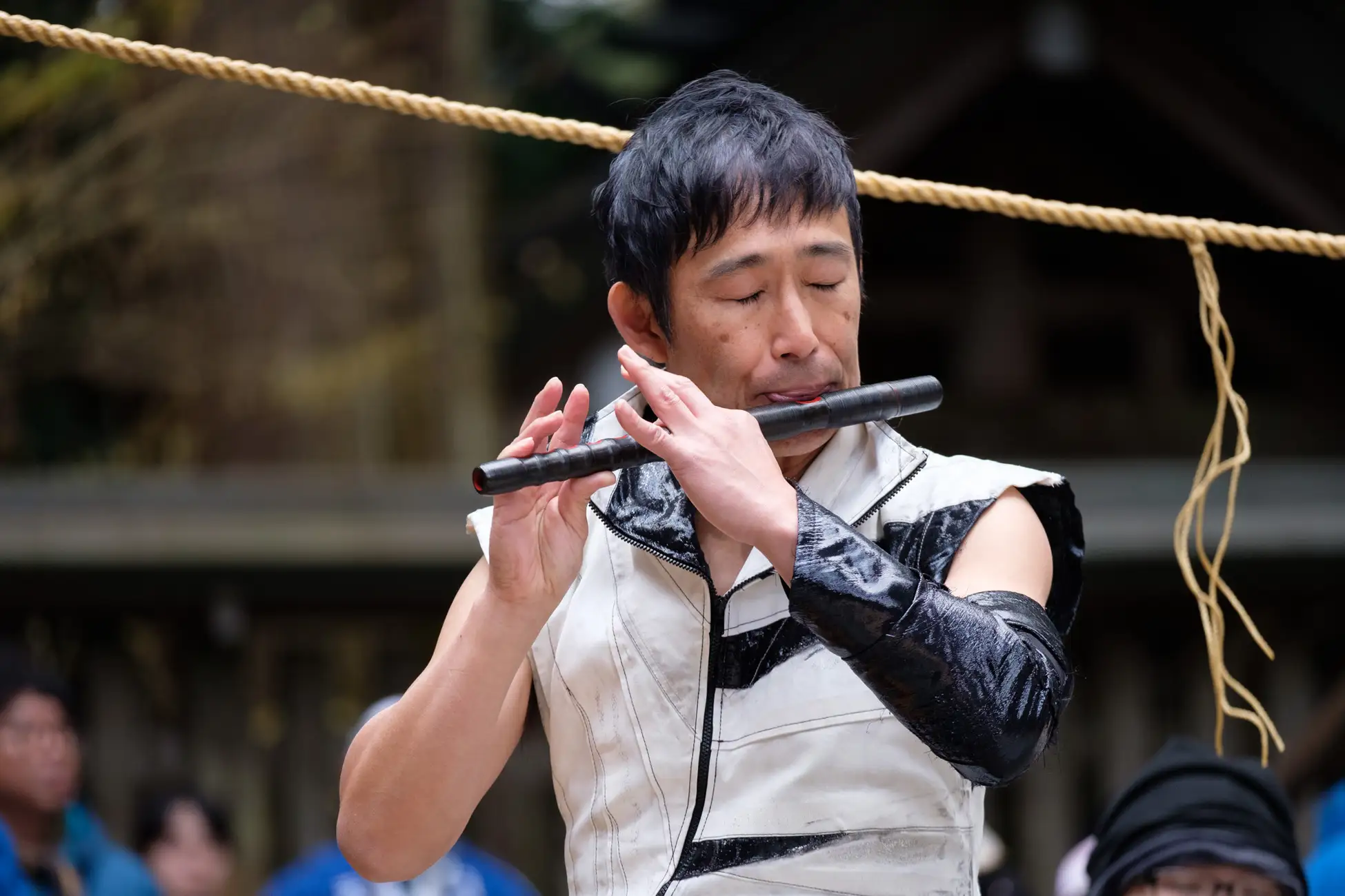 本年の御神体「注連縄張り神事」は、登山家の望月将悟(もちづき・しょうご)氏と天野和明(あまの・かずあき)氏による注連縄の張替とともに、元ブルーハーツのドラマーとして活躍されたミュージシャン梶原徹也(かじわら・てつや)氏や、武道家の荒谷卓(あらや・たかし)氏、舞踊家の酒井はな(さかい・はな)氏、島地保武(しまじ・やすたけ)氏、演奏家の阿部一成(あべ・かずなり)氏等による奉納演奏・演武・演舞や、行われます。