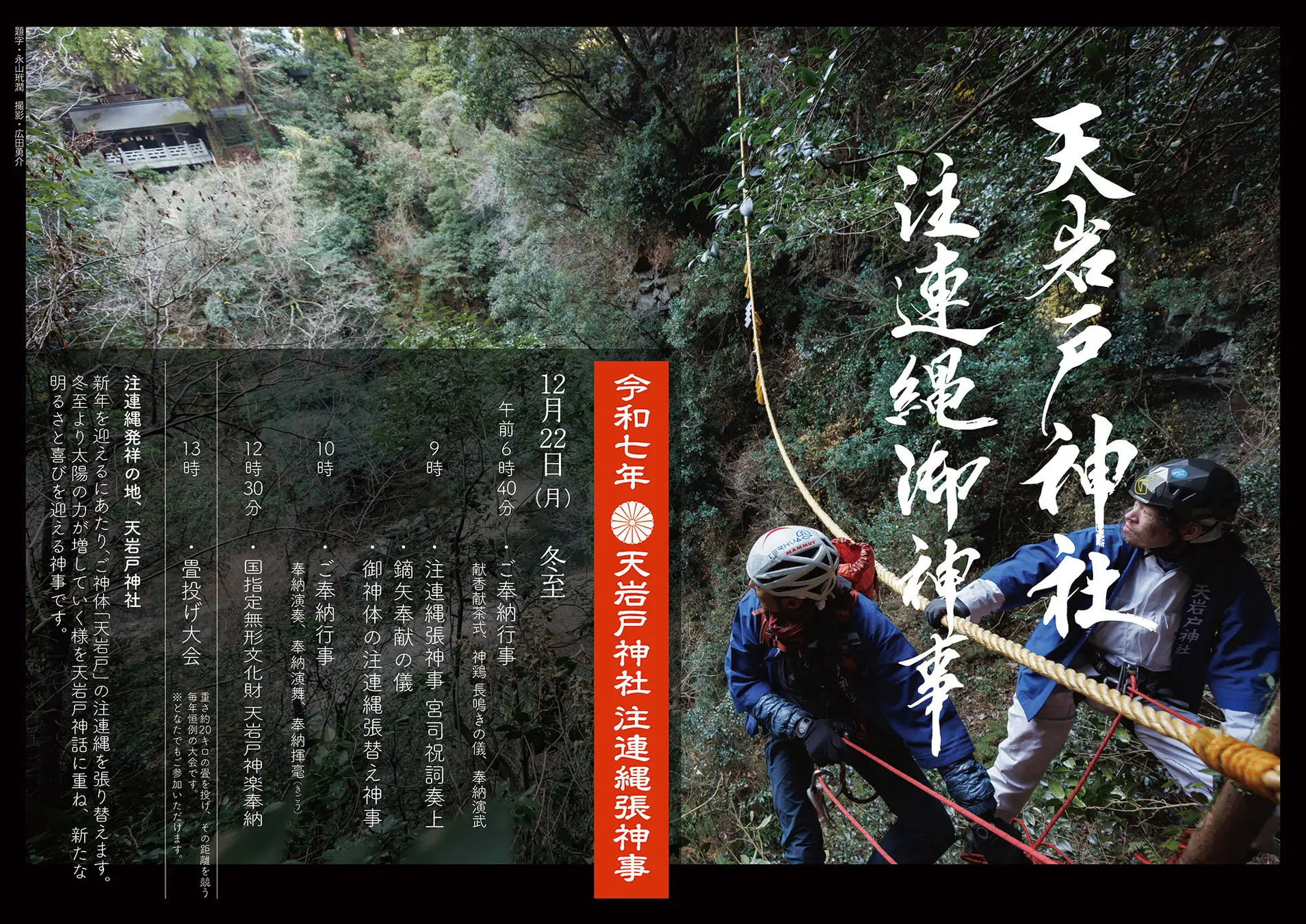 令和三年より、神話に描かれた注連縄張り神事を伝統行事として後世に残し、神話の継承と、明るい世の中が末永く続くようにとの願いを込めて、天岩戸神社では、毎年冬至の日に注連縄の張替えを行い、神事として伝えていくための年末の恒例行事として多くの方に親しまれています。