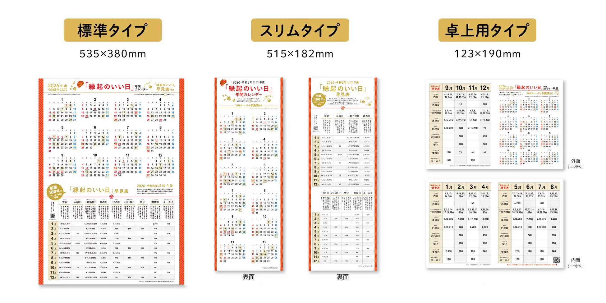また、新日本カレンダーでは、現在販売中の2026年版のカレンダー商品に、特別付録として「縁起のいい日 年間カレンダー」を付けてご提供しています。