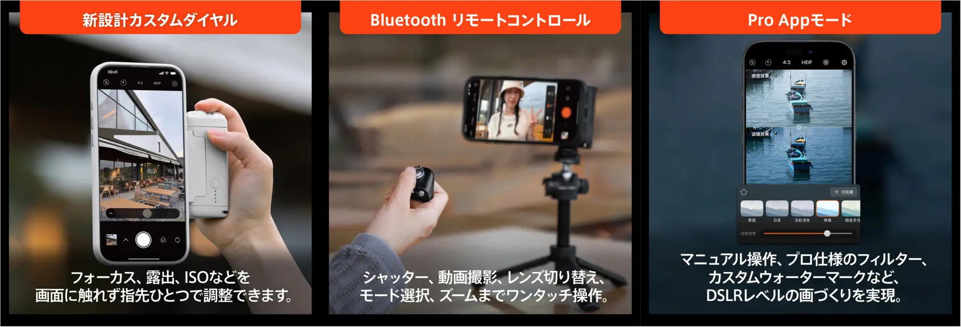 MagSafe対応のスマホグリップとしてスマートフォンに装着して使用できます。快適な握り心地で、Bluetooth接続によりカメラ操作や撮影が可能です。取り外し可能なリモコンを備えており、遠隔から静止画・動画の切り替え、撮影モードの変更、ズーム調整を行えます。前モデルからは新たにカスタムダイヤルを搭載し、フォーカス・露出・ISO の操作にも対応しました。