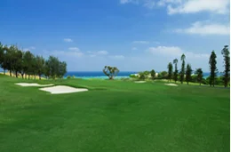 本ホテルが併設される「PGMゴルフリゾート沖縄」は、眼下にはターコイズブルーに輝く東シナ海、はるか本部半島や伊江島を見渡せる壮大な景観が広がり、地元沖縄の方から観光客まで、多くのゴルファーに利用されています。本コースは2017年に青木功プロがコースを改造監修して以来、さらに戦略性が高まったチャンピオンコースです。2017年から2019 年まで、JGTOツアー「HEIWA・PGM CHAMPIONSHIP」を 3年連続で開催。また2023年より「チャリティゴルフ」を開催し、ゴルフを通じたチャリティによる社会貢献活動を行っています。日本を代表する威厳と品位を兼ね備えたハイグレードなゴルフ場ブランド「GRAND PGM」(グランPGM)として運営しています。