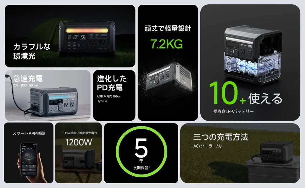 UPS機能で365日24時間、お家のインフラを守りながら、キャンプや車中泊でもそのまま使える、512Wh・600Wのパワーをわずか7.2kgに凝縮し、キャンプや車中泊に気軽に持ち運び可能。