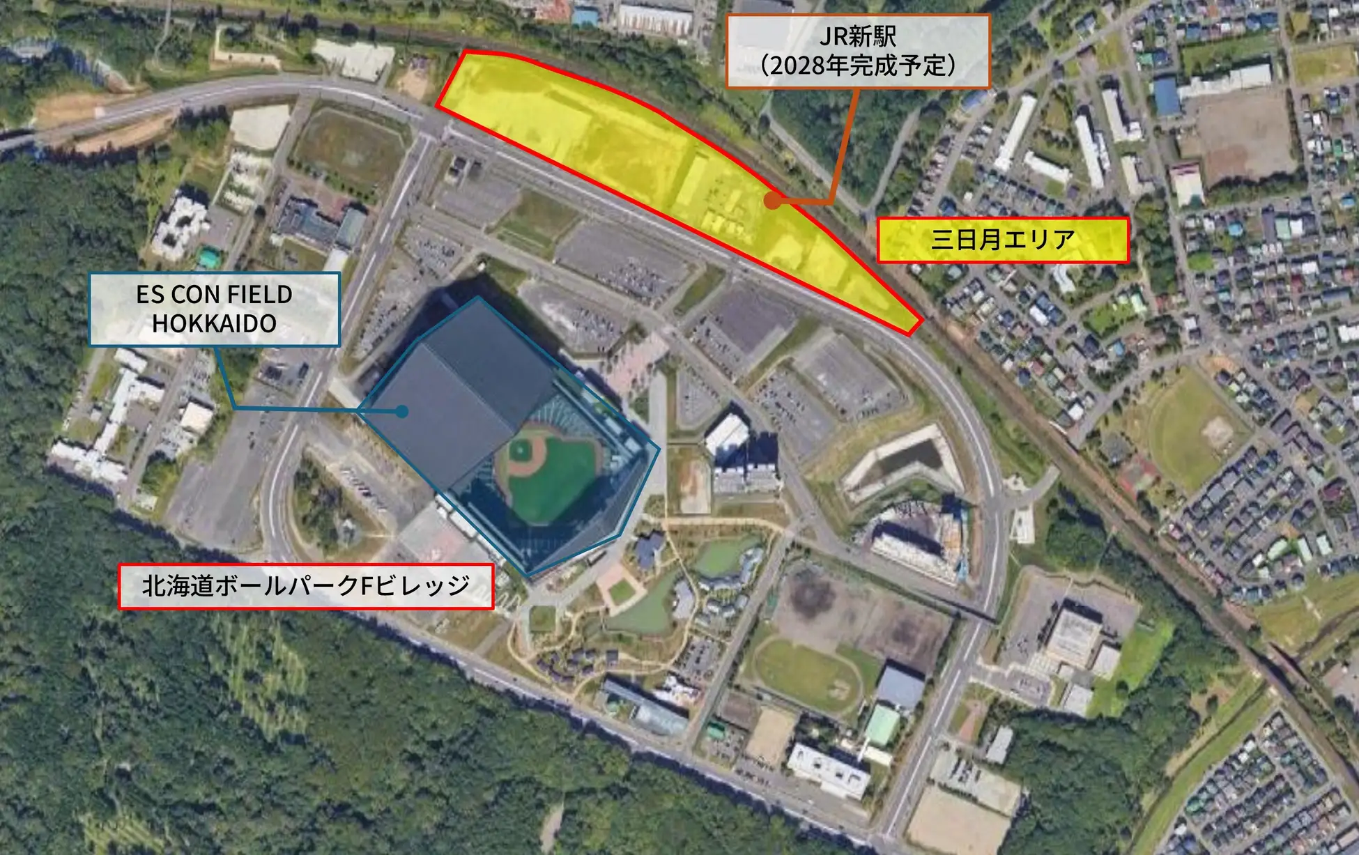 「ES CON FIELD HOKKAIDO」が位置する北海道ボールパークFビレッジ(以下「Fビレッジ」)周辺では、2028年夏頃にJR千歳線新駅の開業が控えており、札幌エリアや新千歳空港からの交通利便性の飛躍的な向上が見込まれています。また、Fビレッジでは、北海道医療大学の移転(2028年4月予定)や、当社が球場近接地にて開発を進めるホテル(2027年秋頃開業予定、ホテルブランド『DHAWA』)をはじめとする新たな開発が進んでいることから、更なる賑わいや発展が期待されます。