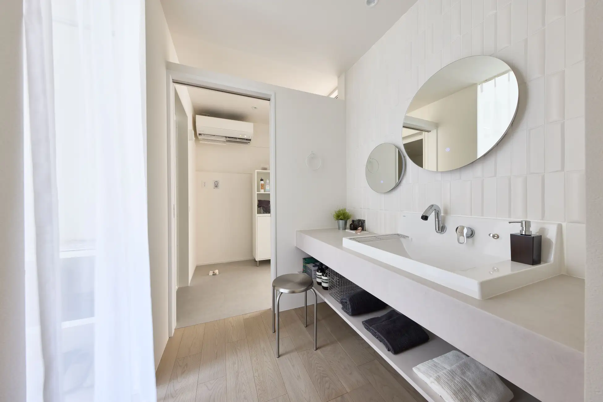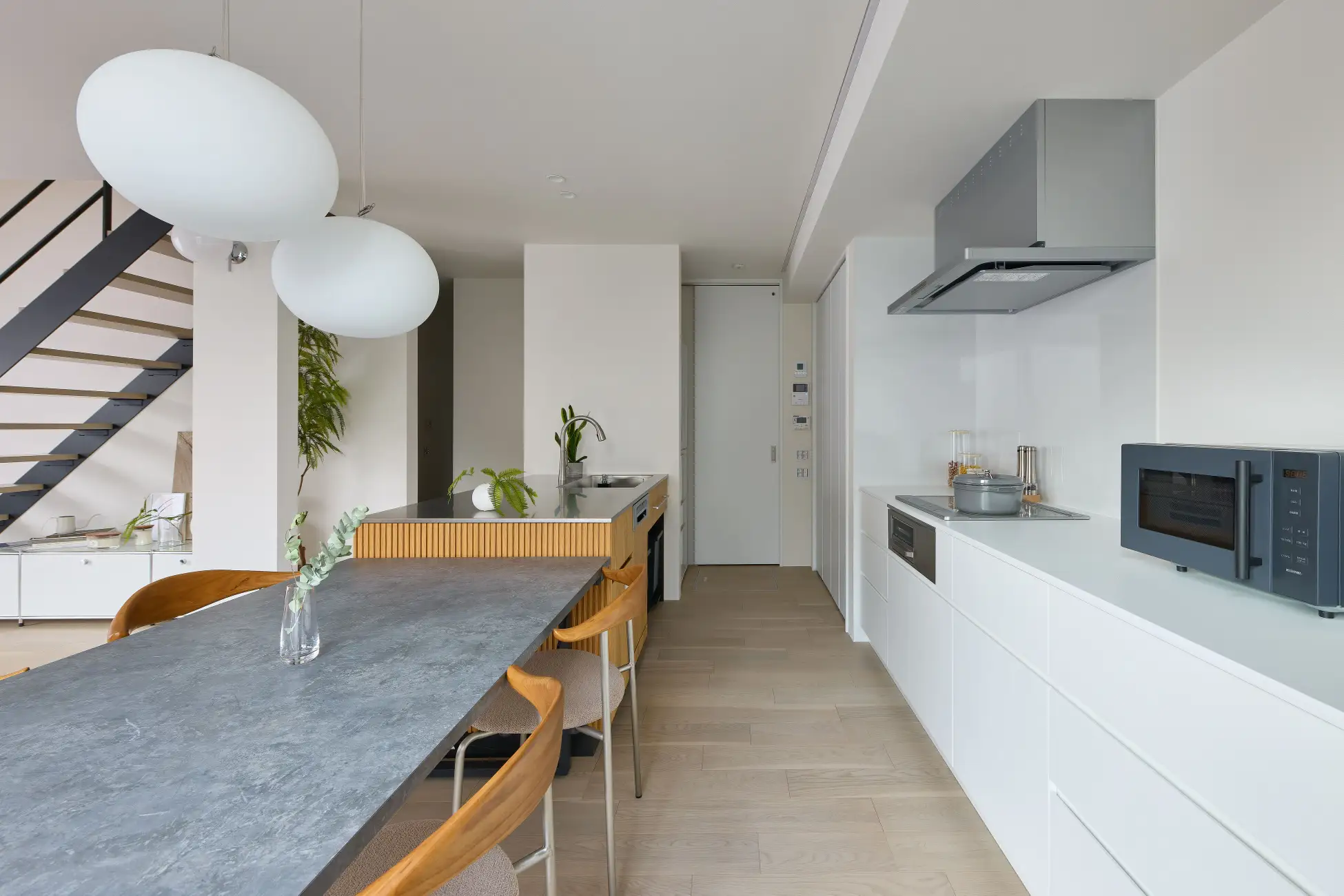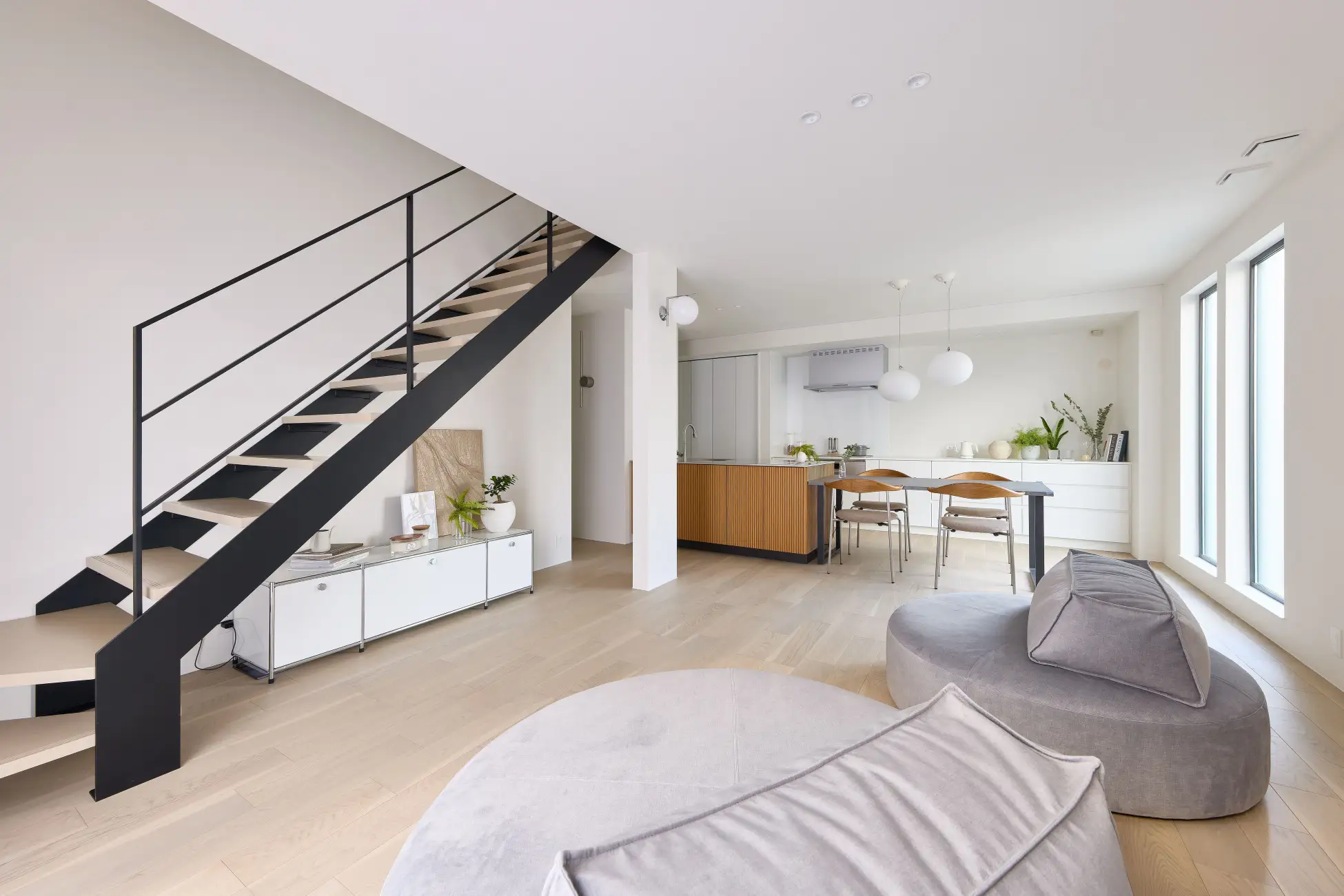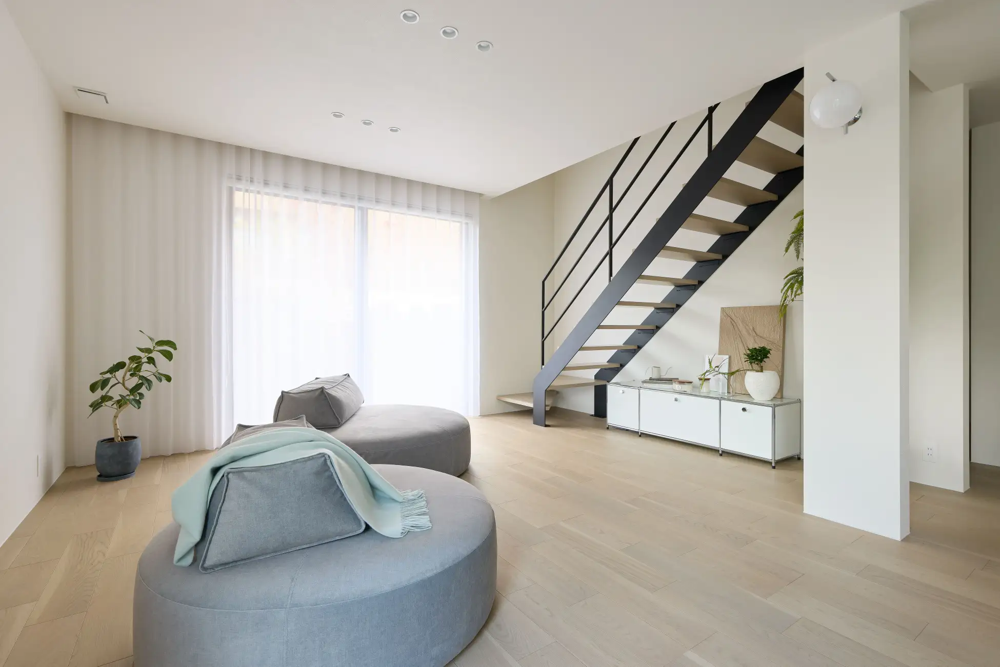 白を基調とした人気の「ジャパンディスタイル」をコンセプトに、素材感や陰影を大切にした落ち着きのある長岡京市モデルハウス。中庭を望む開放的な1階LDKは、視線の抜けと広がりを感じられる設計。アイアン階段が空間のアクセントとなり、住まい全体にのびやかな印象を与えます。