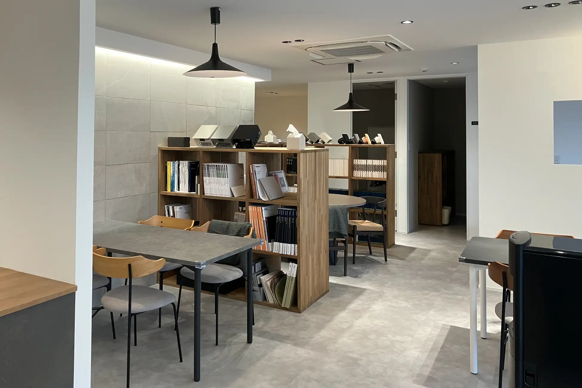 モデルハウスのオープンと同時に、京都市下京区に京都オフィスを開設いたしました。駅徒歩圏で車でのアクセスも良好。事務所内は落ち着いたグレージュカラーを基調に、間接照明と黒のペンダントで陰影を整えた上質な空間に仕上げています。合計8つの打ち合わせスペースには、キッチン天板・床材・タイルなどの実物サンプルをずらりと配置。キッズスペースとドリンクもご用意しており、じっくり仕様選定が可能です。少人数の打ち合わせから詳細な仕様決めまで、快適に行える空間設計となっております。皆様のご来場を心よりお待ちしております。