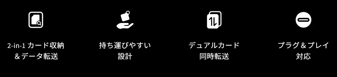 CreateMate 高速ミニカードリーダー内蔵ケースは、SDカード2枚とmicroSDカード4枚を同時に収納でき、SD/microSDのデュアルカードリーダースロットを搭載し、2枚同時読み取りに対応します。USB 3.1 高速チップを内蔵し、最大312MB/sの高速データ転送が可能です。SD UHS-II/UHS-I、microSD UHS-II/UHS-I 規格をサポートし、USB Type-CポートおよびOTG(On-The-Go)対応により、PCからスマートフォンやタブレットまでプラグ&プレイで接続可能です。コンパクトな手のひらサイズで携帯性に優れた設計です。